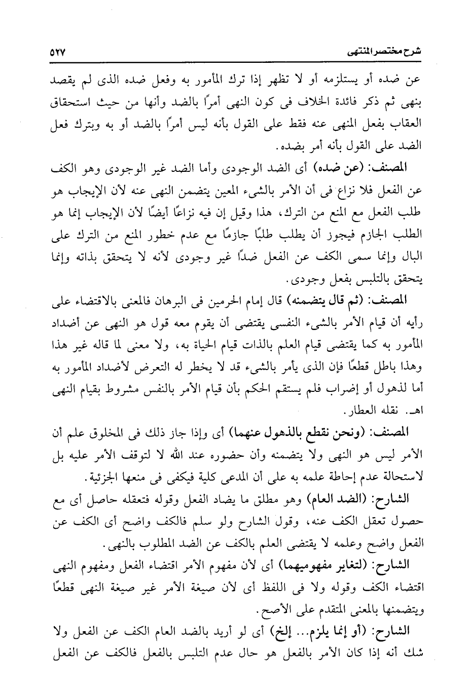 المصنف: (عن ضده) أى الضد الوجودى وأما الضد غير الوجودى وهو الكف عن الفعل فلا نزاع فى أن الأمر بالشئ المعين يتضمن النهى عنه لأن الإيجاب هو طلب الفعل مع المنع من الترك، هذا وقيل إن فيه نزاعًا أيضًا لأن الإيجاب إنما هو الطلب الجازم فيجوز أن يطلب طلبًا جازمًا مع عدم خطور المنع من الترك على البال وإنما سمى الكف عن الفعل ضدًا غير وجودى لأنه لا يتحقق بذاته وإنما يتحقق بالتلبس بفعل وجودى.
