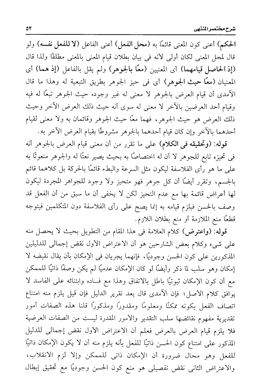 قوله: (واعترض) كلام العلامة فى هذا القام من التطويل بحيث لا يحصل منه على شئ وكلام بعض الشارحين هو أن الاعتراض، الأول نقض إجمالى للدليلين المذكورين على كون الحسن وجوديًا، فإنهما يجريان فى الإمكان بأن يقال نقيضه لا إمكان وهو سلب لما ذكر وأيضًا لو كان الإمكان عدميًا لم يكن وصفًا ذاتيًا للممكن مع أن كون الإمكان ثبوتيًا باطل بالاتفاق وهذا مع فساده وابتنائه على الفاسد لا يوافق كلام الأصل؛ فإن الآمدى قال بعد تقرير الدليل فإن قيل يلزم منه امتناع اتصاف الفعل بكونه ممكنًا ومعلومًا ومقدورًا ومذكورًا قلنا هذه الصفات أمور تقديرية مفهوم نقائضها سلب التقدير والأمور المقدرة ليست من الصفات العرضية فلا يلزم قيام العرض بالعرض فعلم أن الاعتراض الأول نقض إجمالى للدليل المذكور على امتناع كون الحسن ذاتيًا للفعل بأنه يلزم منه أن لا يكون الإمكان ذاتيًا للفعل وهو محال ضرورة أن الإمكان ذاتى للممكن وإلا لزم الانقلاب، والاعتراض الثانى نقض تفصيلى هو منع كون الحسن وجوديًا مع تحقيق إبطال