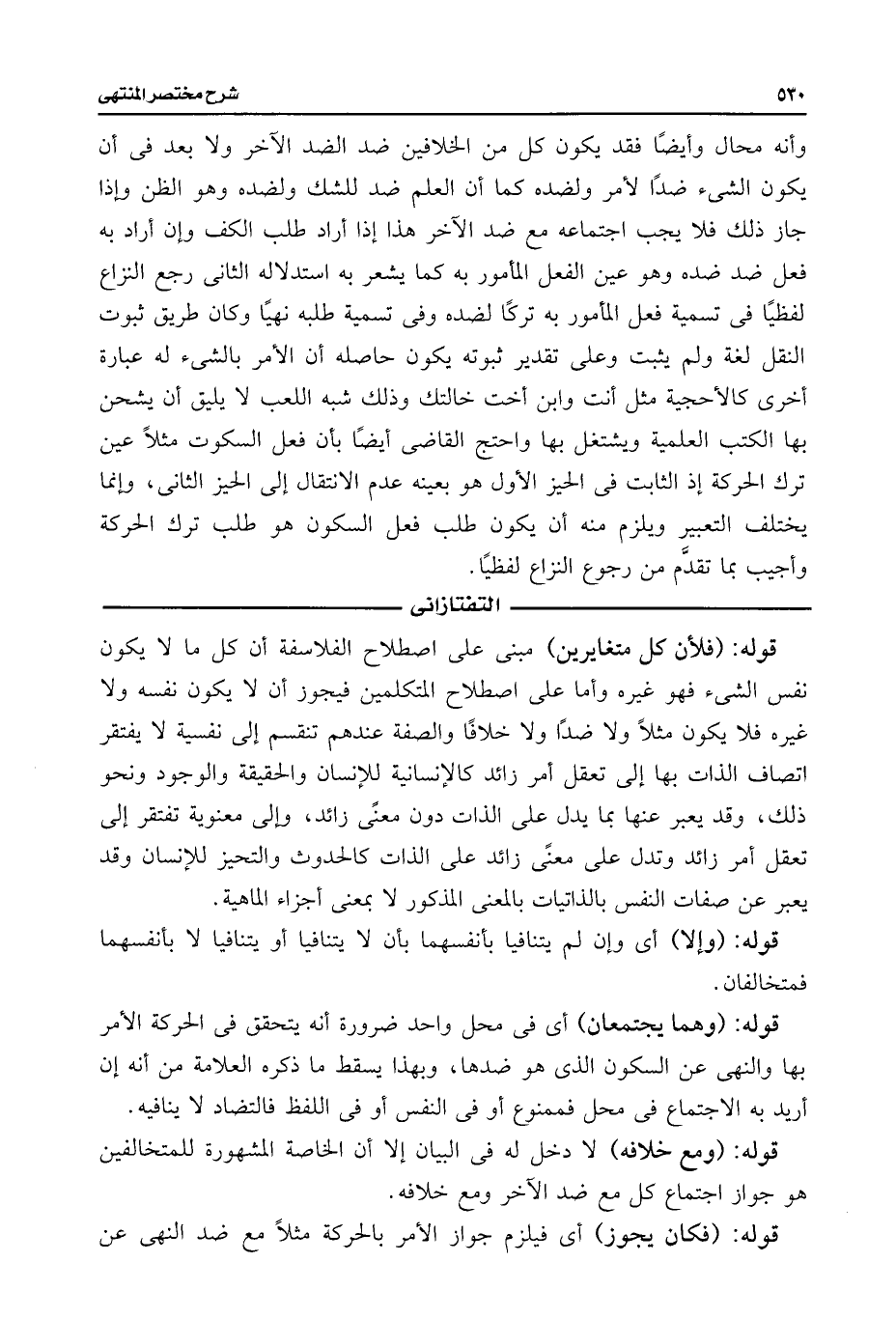 وأنه محال وأيضًا فقد يكون كل من الخلافين ضد الضد الآخر ولا بعد فى أن يكون الشئ ضدًا لأمر ولضده كما أن العلم ضد للشك ولضده وهو الظن وإذا جاز ذلك فلا يجب اجتماعه مع ضد الآخر هذا إذا أراد طلب الكف وإن أراد به فعل ضد ضده وهو عين الفعل المأمور به كما يشعر به استدلاله الثانى رجع النزاع لفظيًا فى تسمية فعل المأمور به تركًا لضده وفى تسمية طلبه نهيًا وكان طريق ثبوت النقل لغة ولم يثبت وعلى تقدير ثبوته يكون حاصله أن الأمر بالشئ له عبارة أخرى كالأحجية مثل أنت وابن أخت خالتك وذلك شبه اللعب لا يليق أن يشحن بها الكتب العلمية ويشتغل بها واحتج القاضى أيضًا بأن فعل المسكوت مثلًا عين ترك الحركة إذ الثابت فى الحيز الأول هو بعينه عدم الانتقال إلى الحيز الثانى، وإنما يختلف التعبير ويلزم منه أن يكون طلب فعل السكون هو طلب ترك الحركة وأجيب بما تقدَّم من رجوع النزاع لفظيًا.
