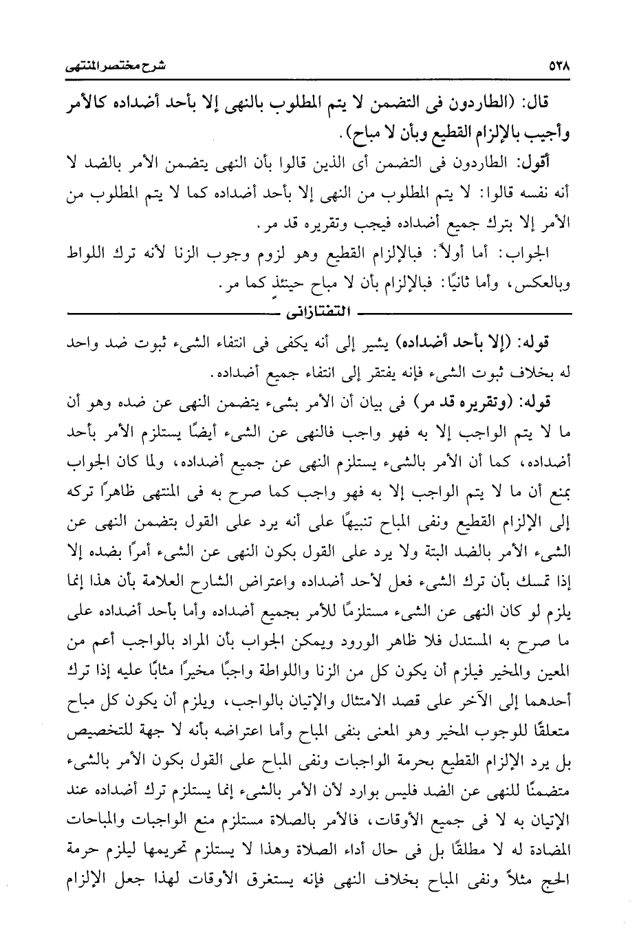 قوله: (وتقريره قد مر) فى بيان أن الأمر بشئ يتضمن النهى عن ضده وهو أن ما لا يتم الواجب إلا به فهو واجب فالنهى عن الشئ أيضًا يستلزم الأمر بأحد أضداده، كما أن الأمر بالشئ يستلزم النهى عن جميع أضداده، ولما كان الجواب بمنع أن ما لا يتم الواجب إلا به فهو واجب كما صرح به فى المنتهى ظاهرًا تركه إلى الإلزام القطيع ونفى المباح تنبيهًا على أنه يرد على القول بتضمن النهى عن الشئ الأمر بالضد البتة ولا يرد على القول بكون النهى عن الشئ أمرًا بضده إلا إذا تمسك بأن ترك الشئ فعل لأحد أضداده واعتراض الشارح العلامة بأن هذا إنما يلزم لو كان النهى عن الشئ مستلزمًا للأمر بجميع أضداده وأما بأحد أضداده على ما صرح به المستدل فلا ظاهر الورود ويمكن الجواب بأن المراد بالواجب أعم من المعين والمخير فيلزم أن يكون كل من الزنا واللواطة واجبًا مخيرًا مثابًا عليه إذا ترك أحدهما إلى الآخر على قصد الامتثال والإتيان بالواجب، ويلزم أن يكون كل مباح متعلقًا للوجوب المخير وهو المعنى بنفى المباح وأما اعتراضه بأنه لا جهة للتخصيص بل يرد الإلزام القطيع بحرمة الواجبات ونفى المباح على القول يكون الأمر بالشئ متضمنًا للنهى عن الضد فليس بوارد لأن الأمر بالشئ إنما يستلزم ترك أضداده عند الإتيان به لا فى جميع الأوقات، فالأمر بالصلاة مستلزم منع الواجبات والمباحات المضادة له لا مطلقًا بل فى حال أداء الصلاة وهذا لا يستلزم تحريمها ليلزم حرمة الحج مثلًا ونفى المباح بخلاف النهى فإنه يستغرق الأوقات لهذا جعل الإلزام