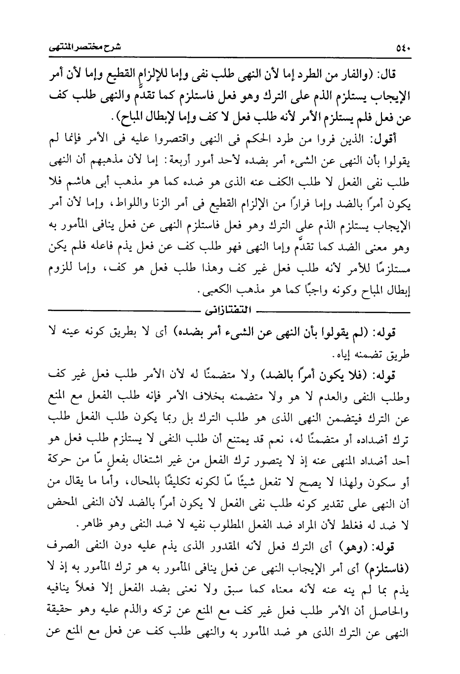 أقول: الذين فروا من طرد الحكم فى النهى واقتصروا عليه فى الأمر فإنما لم يقولوا بأن النهى عن الشئ أمر بضده لأحد أمور أربعة: إما لأن مذهبهم أن النهى طلب نفى الفعل لا طلب الكف عنه الذى هو ضده كما هو مذهب أبى هاشم فلا يكون أمرًا بالضد وأما فرارًا من الإلزام القطيع فى أمر الزنا واللواط، وإما لأن أمر الإيجاب يستلزم الذم على الترك وهو فعل فاستلزم النهى عن فعل ينافى المأمور به وهو معنى الضد كما تقدَّم وإما النهى فهو طلب كف عن فعل يذم فاعله فلم يكن مستلزمًا للأمر لأنه طلب فعل غير كف وهذا طلب فعل هو كف، وإما للزوم إبطال المباح وكونه واجبًا كما هو مذهب الكعبى.