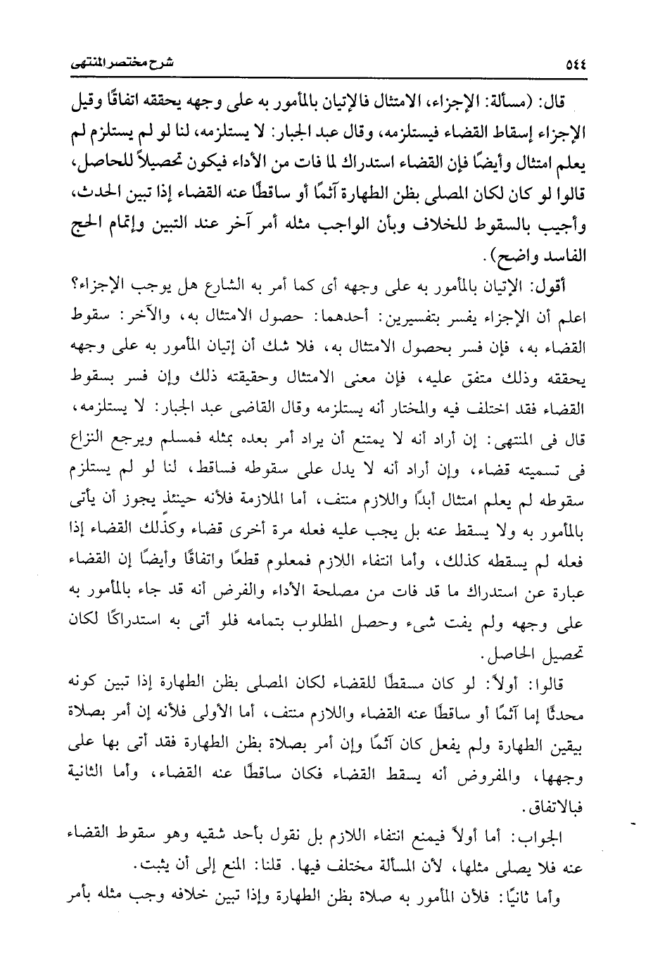 أقول: الإتيان بالمأمور به على وجهه أى كما أمر به الشارع هل يوجب الإجزاء؟ أعلم أن الإجزاء يفسر بتفسيرين: أحدهما: حصول الامتثال به، والآخر: سقوط القضاء به، فإن فسر بحصول الامتثال به، فلا شك أن إتيان المأمور به على وجهه يحققه وذلك متفق عليه، فإن معنى الامتثال وحقيقته ذلك وإن فسر بسقوط القضاء فقد اختلف فيه والمختار أنه يستلزمه وقال القاضى عبد الجبار: لا يستلزمه، قال فى المنتهى: إن أراد أنه لا يمتنع أن يراد أمر بعده بمثله فمسلم ويرجع النزاع فى تسميته قضاء، وإن أراد أنه لا يدل على سقوطه فساقط، لنا لو لم يستلزم سقوطه لم يعلم امتثال أبدًا واللازم منتف، أما الملازمة فلأنه حينئذٍ يجوز أن يأتى بالمأمور به ولا يسقط عنه بل يجب عليه فعله مرة أخرى قضاء وكذلك القضاء إذا فعله لم يسقطه كذلك، وأما انتفاء اللإزم فمعلوم قطعًا واتفاقًا وأيضًا إن القضاء عبارة عن استدراك ما قد فات من مصلحة الأداء والفرض أنه قد جاء بالمأمور به على وجهه ولم يفت شئ وحصل المطلوب بتمامه فلو أتى به استدراكًا لكان تحصيل الحاصل.