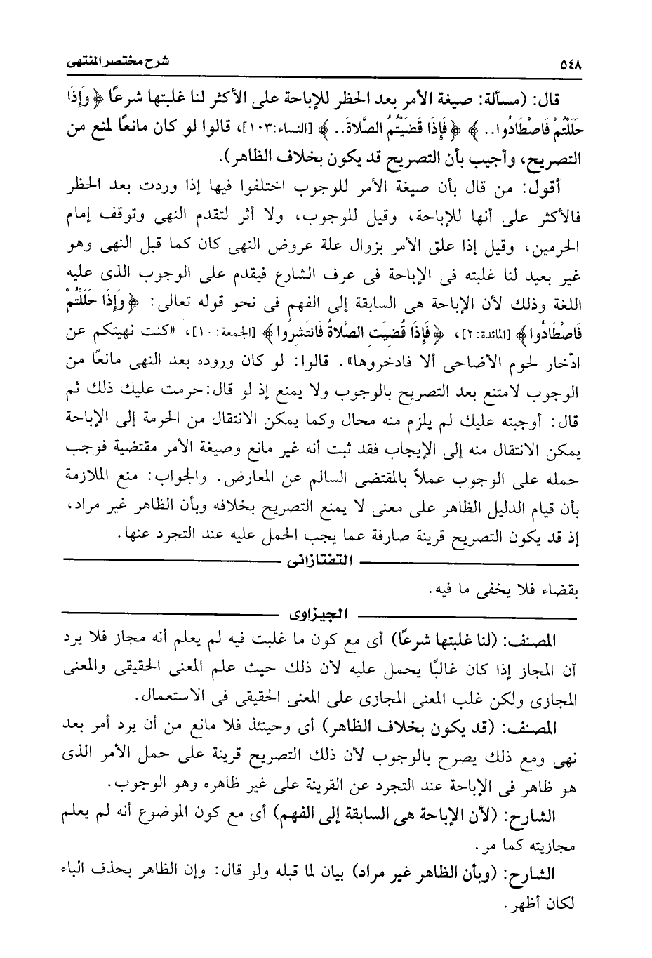 قال: (مسألة: صيغة الأمر بعد الحظر للإباحة على الأكثر لنا غلبتها شرعًا {وَإِذَا حَلَلْتُمْ فَاصْطَادُوا. .} {فَإِذَا قَضَيْتُمُ الصَّلَاةَ. .} [النساء: ١٠٣]، قالوا لو كان مانعًا لمنع من التصريح، وأجيب بأن التصريح قد يكون بخلاف الظاهر).