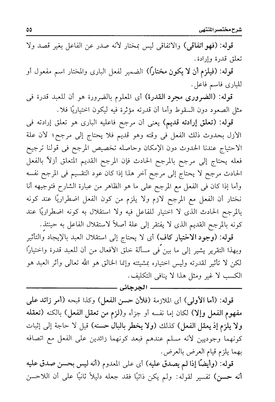 قوله: (الضرورى مجرد القدرة) أى المعلوم بالضرورة هو أن للعبد قدرة فى مثل الصعود دون السقوط وأما أن قدرته مؤثرة فيه ليكون اختياريًا فلا.