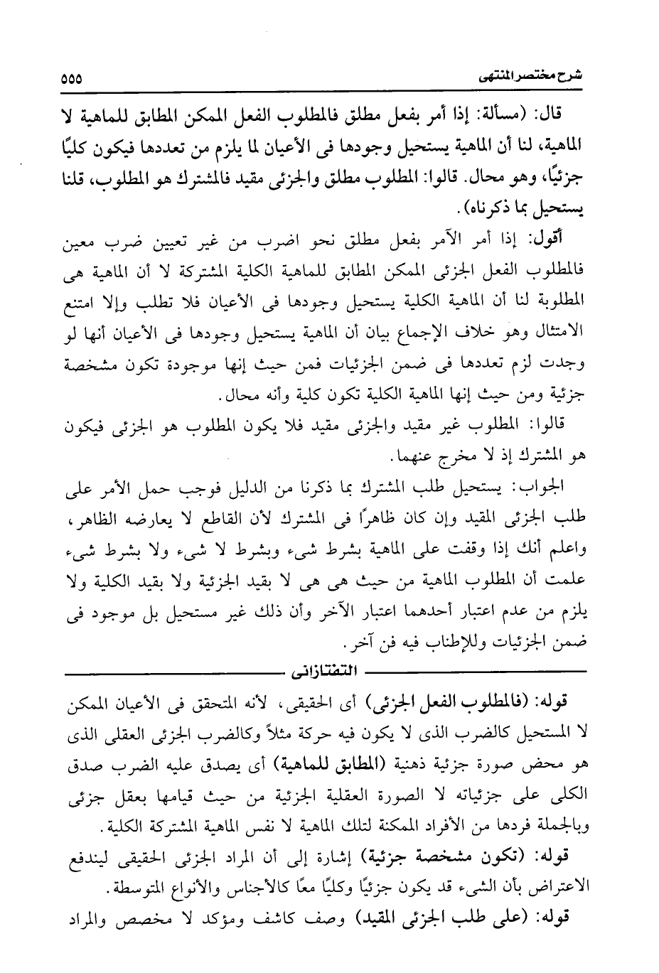أقول: إذا أمر الآمر بفعل مطلق نحو اضرب من غير تعيين ضرب معين فالمطلوب الفعل الجزئى الممكن المطابق للماهية الكلية المشتركة لا أن الماهية هى المطلوبة لنا أن الماهية الكلية يستحيل وجودها فى الأعيان فلا تطلب وإلا امتنع الامتثال وهو خلاف الإجماع بيان أن الماهية يستحيل وجودها فى الأعيان أنها لو وجدت لزم تعددها فى ضمن الجزئيات فمن حيث إنها موجودة تكون مشخصة جزئية ومن حيث إنها الماهية الكلية تكون كلية وأنه محال.
