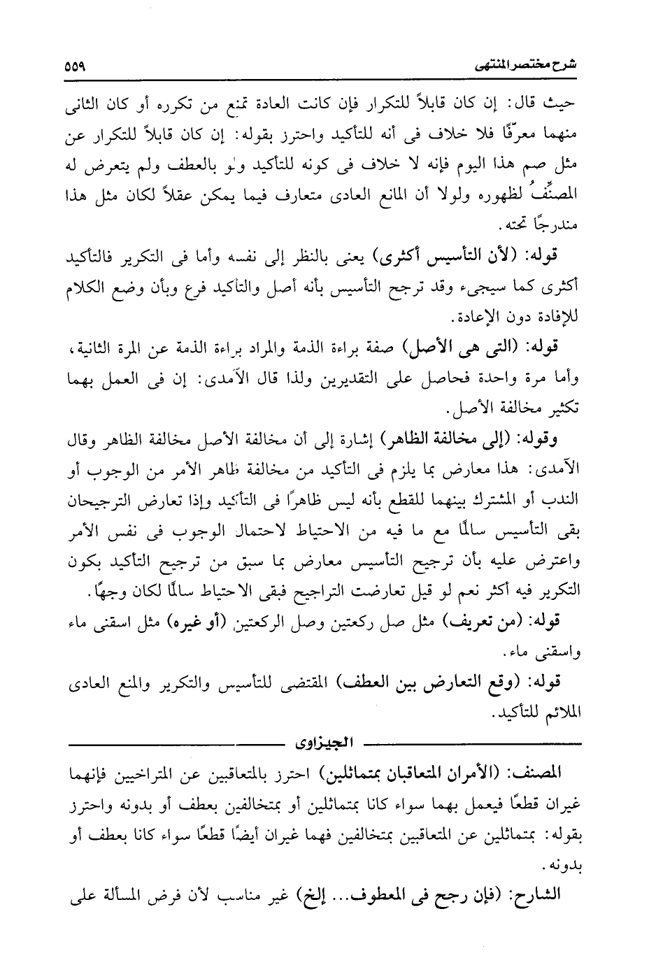 حيث قال: إن كان قابلًا للتكرار فإن كانت العادة تمنع من تكرره أو كان الثانى منهما معرّفًا فلا خلاف فى أنه للتأكيد واحترز بقوله: إن كان قابلًا للتكرار عن مثل صم هذا اليوم فإنه لا خلاف فى كونه للتأكيد ولو بالعطف ولم يتعرض له المصنِّفُ لظهوره ولولا أن المانع العادى متعارف فيما يمكن عقلًا لكان مثل هذا مندرجًا تحته.