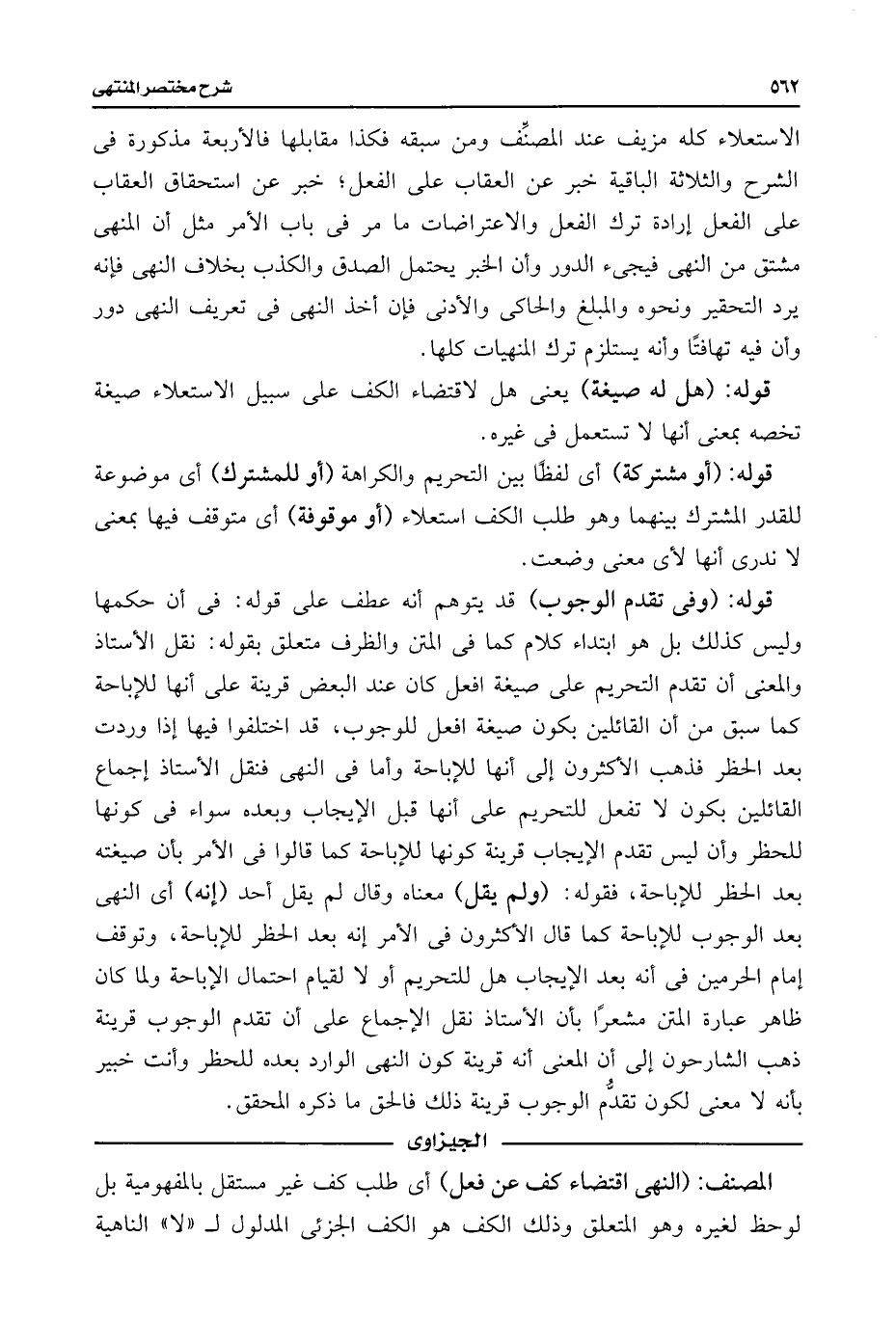 المصنف: (النهى اقتضاء كف عن فعل) أى طلب كف غير مستقل بالمفهومية بل لوحظ لغيره وهو المتعلق وذلك الكف هو الكف الجزئى المدلول لـ"لا" الناهية