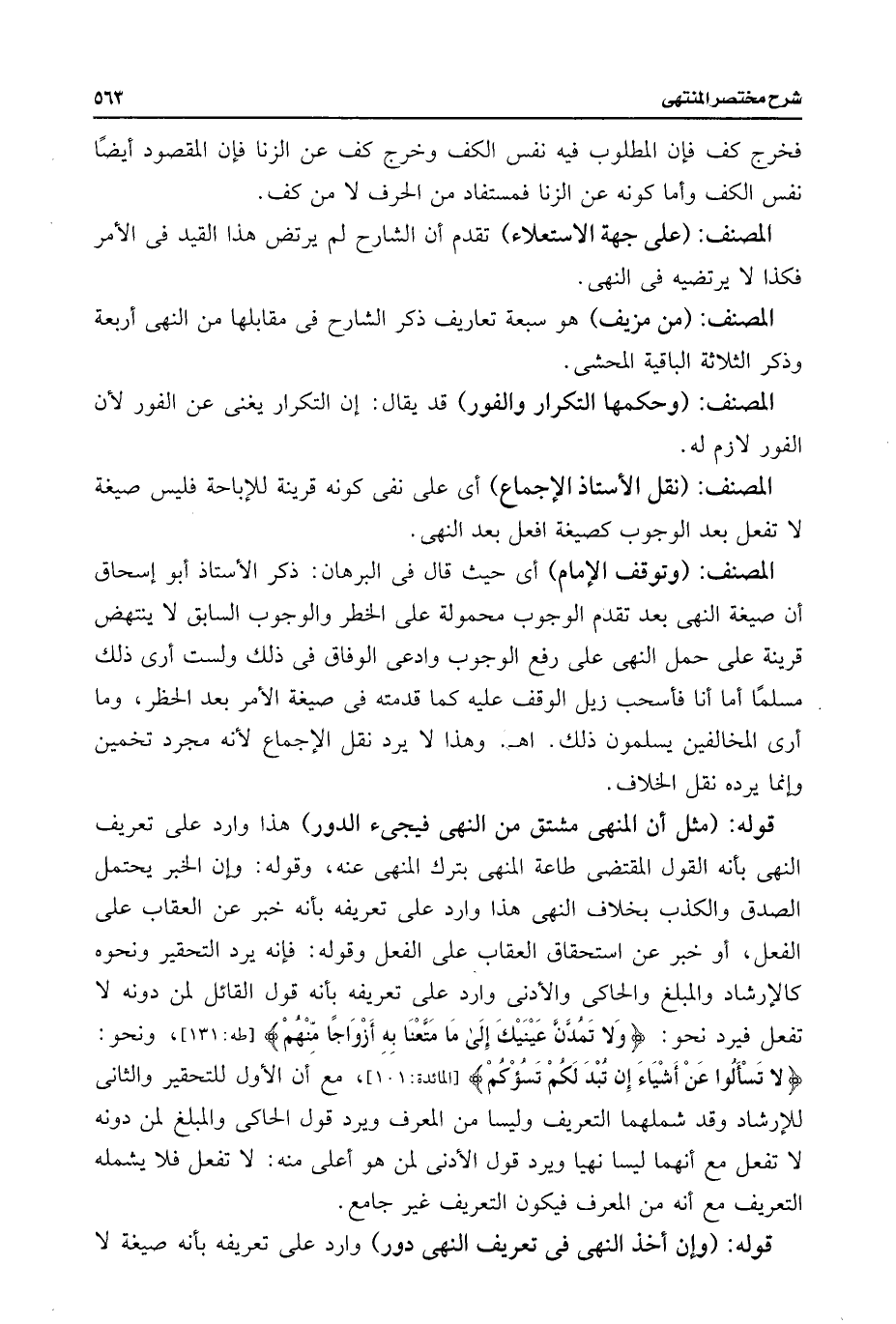 قوله: (مثل أن المنهى مشتق من النهى فيجئ الدور) هذا وارد على تعريف النهى بأنه القول المقتضى طاعة المنهى بترك المنهى عنه، وقوله: وإن الخبر يحتمل الصدق والكذب بخلاف النهى هذا وارد على تعريفه بأنه خبر عن العقاب على الفعل، أو خبر عن استحقاق العقاب على الفعل وقوله: فإنه يرد التحقير ونحوه كالإرشاد والمبلغ والحاكى والأدنى وارد على تعريفه بأنه قول القائل لمن دونه لا تفعل فيرد نحو: {وَلَا تَمُدَّنَّ عَيْنَيْكَ إِلَى مَا مَتَّعْنَا بِهِ أَزْوَاجًا مِنْهُمْ} [طه: ١٣١]، ونحو: {لَا تَسْأَلُوا عَنْ أَشْيَاءَ إِنْ تُبْدَ لَكُمْ تَسُؤْكُمْ} [المائدة: ١٠١]، مع أن الأول للتحقير والثانى للإرشاد وقد شملهما التعريف وليسا من المعرف ويرد قول الحاكى والمبلغ لمن دونه لا تفعل مع أنهما ليسا نهيا ويرد قول الأدنى لمن هو أعلى منه: لا تفعل فلا يشمله التعريف مع أنه من المعرف فيكون التعريف غير جامع.