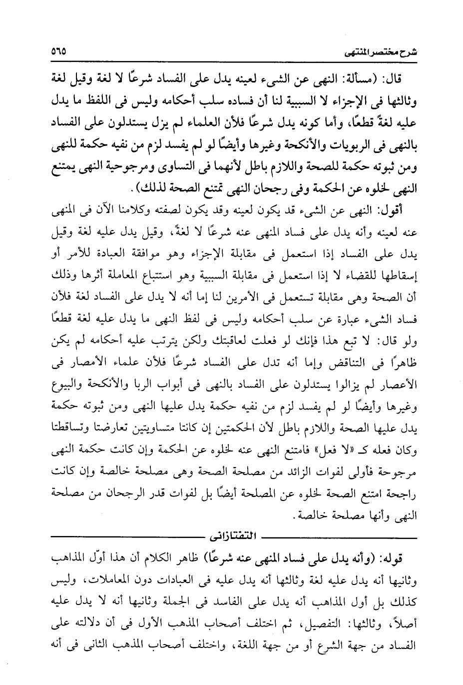 أقول: النهى عن الشئ قد يكون لعينه وقد يكون لصفته وكلامنا الآن فى المنهى عنه لعينه وأنه يدل على فساد المنهى عنه شرعًا لا لغةً، وقيل يدل عليه لغة وقيل يدل على الفساد إذا استعمل فى مقابلة الإجزاء وهو موافقة العبادة للأمر أو إسقاطها للقضاء لا إذا استعمل فى مقابلة السببية وهو استتباع المعاملة أثرها وذلك أن الصحة وهى مقابلة تستعمل فى الأمرين لنا إما أنه لا يدل على الفساد لغة فلأن فساد الشئ عبارة عن سلب أحكامه وليس فى لفظ النهى ما يدل عليه لغة قطعًا ولو قال: لا تبع هذا فإنك لو فعلت لعاقبتك ولكن يترتب عليه أحكامه لم يكن ظاهرًا فى التناقض وإما أنه تدل على الفساد شرعًا فلأن علماء الأمصار فى الأعصار لم يزالوا يستدلون على الفساد بالنهى فى أبواب الربا والأنكحة والبيوع وغيرها وأيضًا لو لم يفسد لزم من نفيه حكمة يدل عليها النهى ومن ثبوته حكمة يدل عليها الصحة واللازم باطل لأن الحكمتين إن كانتا متساويتين تعارضتا وتساقطتا وكان فعله كـ "لا فعل" فامتنع النهى عنه لخلوه عن الحكمة وإن كانت حكمة النهى مرجوحة فأولى لفوات الزائد من مصلحة الصحة وهى مصلحة خالصة وإن كانت راجحة امتنع الصحة لخلوه عن المصلحة أيضًا بل لفوات قدر الرجحان من مصلحة النهى وأنها مصلحة خالصة.