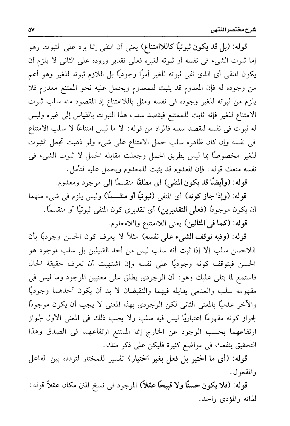 قوله: (بل قد يكون ثبوتيًا كاللاامتناع) يعنى أن النفى إنما يرد على الثبوت وهو إما ثبوت الشئ فى نفسه أو ثبوته لغيره فعلى تقدير وروده على الثانى لا يلزم أن يكون المنفى أى الذى نفى ثبوته للغير أمرًا وجوديًا بل اللازم ثبوته للغير وهو أعم من وجوده له فإن المعدوم قد يثبت للمعدوم ويحمل عليه نحو الممتنع معدوم فلا يلزم من ثبوته للغير وجوده فى نفسه ومثل باللاامتناع إذ المقصود منه سلب ثبوت الامتناع للغير فإنه ثابت للممتنع فيقصد سلب هذا الثبوت بالقياس إلى غيره وليس له ثبوت فى نفسه ليقصد سلبه فالمراد من قوله: لا ما ليس امتناعًا لا سلب الامتناع فى نفسه وإن كان ظاهره سلب حمل الامتناع على شئ ولو ذهبت تجعل الثبوت للغير مخصوصًا بما ليس بطريق الحمل وجعلت مقابله الحمل لا ثبوت الشئ فى نفسه منعك قوله: فإن المعدوم قد يثبت للمعدوم ويحمل عليه فتأمل.