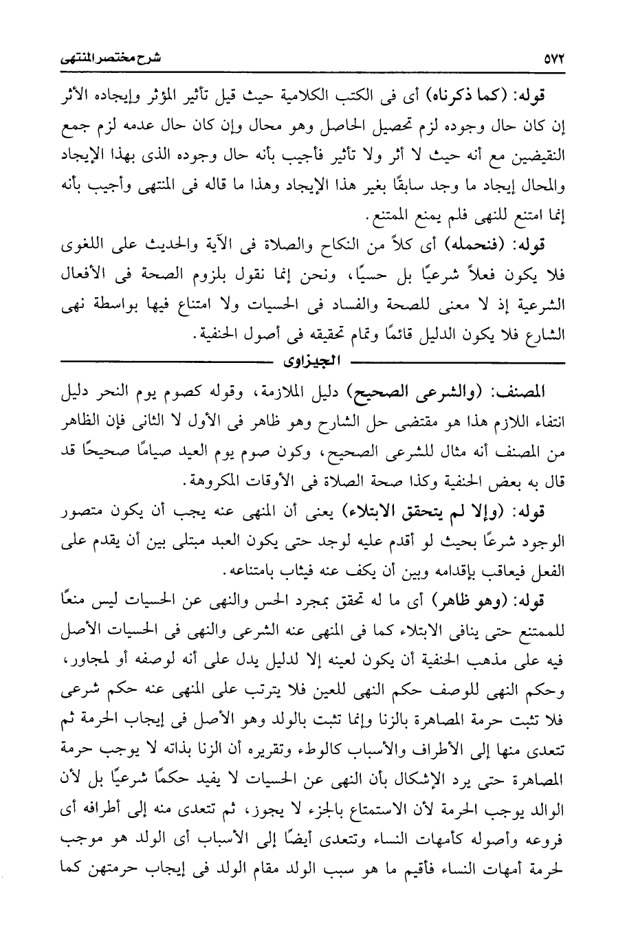 قوله: (وهو ظاهر) أى ما له تحقق بمجرد الحس والنهى عن الحسيات ليس منعًا للممتنع حتى ينافى الابتلاء كما فى المنهى عنه الشرعى والنهى فى الحسيات الأصل فيه على مذهب الحنفية أن يكون لعينه إلا لدليل يدل على أنه لوصفه أو لمجاور، وحكم النهى للوصف حكم النهى للعين فلا يترتب على النهى عنه حكم شرعى فلا تثبت حرمة المصاهرة بالزنا وإنما تثبت بالولد وهو الأصل فى إيجاب الحرمة ثم تتعدى منها إلى الأطراف والأسباب كالوطء وتقريره أن الزنا بذاته لا يوجب حرمة المصاهرة حتى يرد الإشكال بأن النهى عن الحسيات لا يفيد حكمًا شرعيًا بل لأن الوالد يوجب الحرمة لأن الاستمتاع بالجزء لا يجوز، ثم تتعدى منه إلى أطرافه أى فروعه وأصوله كأمهات النساء وتتعدى أيضًا إلى الأسباب أى الولد هو موجب لحرمة أمهات النساء فأقيم ما هو سبب الولد مقام الولد فى إيجاب حرمتهن كما