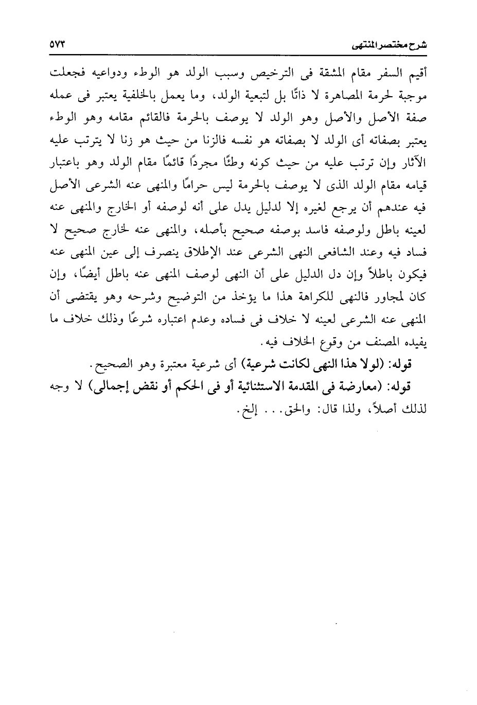 أقيم السفر مقام المشقة فى الترخيص وسبب الولد هو الوطء ودواعيه فجعلت موجبة لحرمة المصاهرة لا ذاتًا بل لتبعية الولد، وما يعمل بالخلفية يعتبر فى عمله صفة الأصل والأصل وهو الولد لا يوصف بالحرمة فالقائم مقامه وهو الوطء يعتبر بصفاته أى الولد لا بصفاته هو نفسه فالزنا من حيث هو زنا لا يترتب عليه الآثار وإن ترتب عليه من حيث كونه وطئًا مجردًا قائمًا مقام الولد وهو باعتبار قيامه مقام الولد الذى لا يوصف بالحرمة ليس حرامًا والمنهى عنه الشرعى الأصل فيه عندهم أن يرجع لغيره إلا لدليل يدل على أنه لوصفه أو الخارج والمنهى عنه لعينه باطل ولوصفه فاسد بوصفه صحيح بأصله، والمنهى عنه لخارج صحيح لا فساد فيه وعند الشافعى النهى الشرعى عند الإطلاق ينصرف إلى عين المنهى عنه فيكون باطلًا وإن دل الدليل على أن النهى لوصف المنهى عنه باطل أيضًا، وإن كان لمجاور فالنهى للكراهة هذا ما يؤخذ من التوضيح وشرحه وهو يقتضى أن المنهى عنه الشرعى لعينه لا خلاف فى فساده وعدم اعتباره شرعًا وذلك خلاف ما يفيده المصنف من وقوع الخلاف فيه.