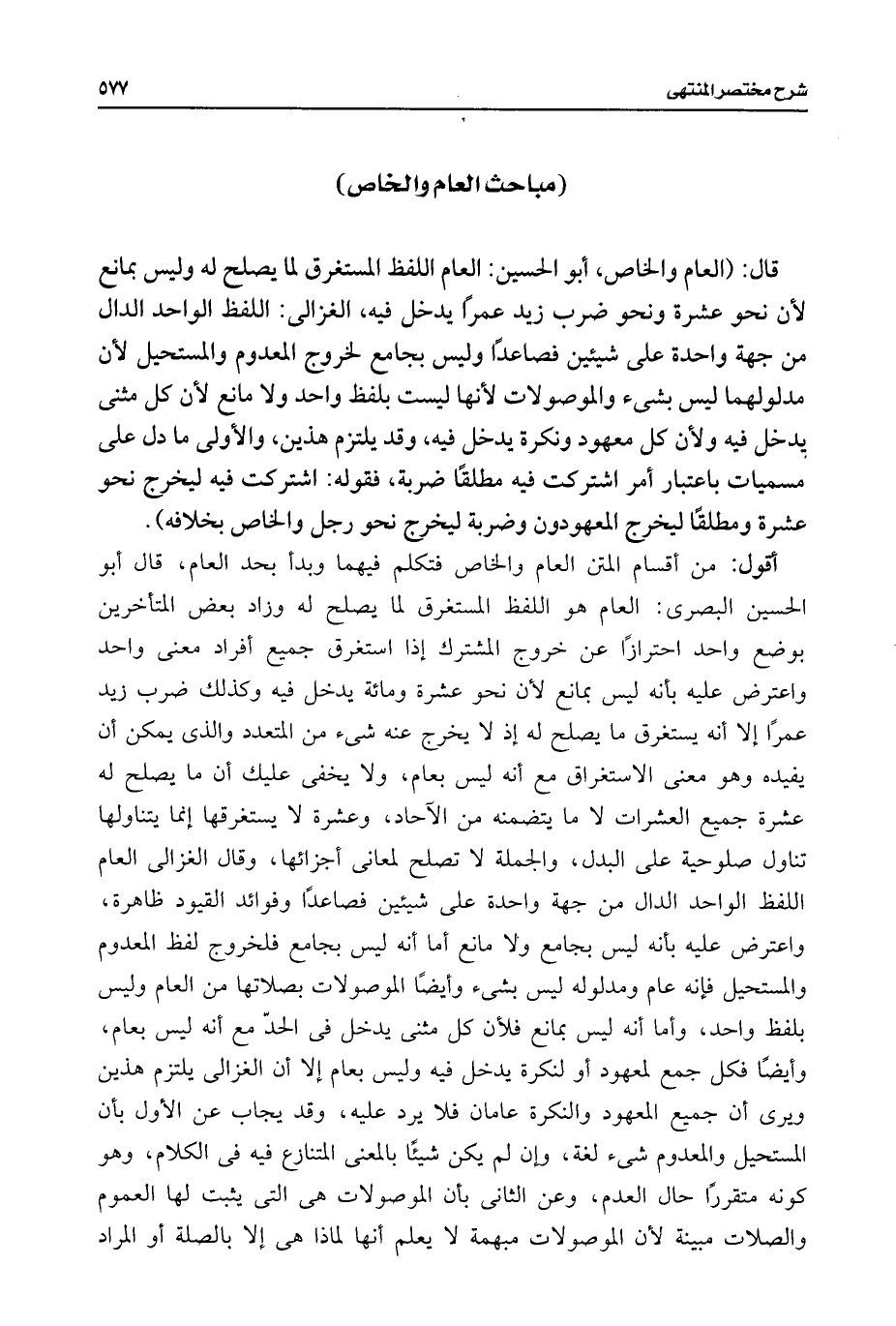 قال: (العام والخاص، أبو الحسين: العام اللفظ المستغرق لما يصلح له وليس بمانع لأن نحو عشرة ونحو ضرب زيد عمرًا يدخل فيه، الغزالى: اللفظ الواحد الدال من جهة واحدة على شيئين فصاعدًا وليس بجامع لخروج المعدوم والمستحيل لأن مدلولهما ليس بشئ والموصولات لأنها ليست بلفظ واحد ولا مانع لأن كل مثنى يدخل فيه ولأن كل معهود ونكرة يدخل فيه، وقد يلتزم هذين، والأولى ما دل على مسميات باعتبار أمر اشتركت فيه مطلقًا ضربة، فقوله: اشتركت فيه ليخرج نحو عشرة ومطلقًا ليخرج المعهودون وضربة ليخرج نحو رجل والخاص بخلافه).
