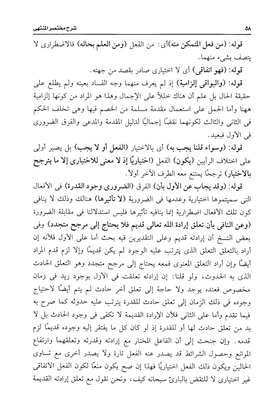 قوله: (وقد يجاب عن الأول بأن) الفرق (الضرورى وجود القدرة) فى الأفعال التى سميتموها اختيارية وعدمها فى الضرورية (لا تأثيرها) هنالك وذلك لا ينافى كون تلك الافعال اضطرارية إنما ينافيه تأثيرها فليس استدلالنا فى مقابلة الضرورة (وعن النافى بأن تعلق إرادة اللَّه تعالى قديم فلا يحتاج إلى مرجح متجدد) وفى بعض النسخ أن إرادته قديم وعلى التقديرين فيه بحث أما على الأول فلأنه إن أراد بالتعلق التعلق الذى يترتب عليه الوجود لم يكن قديمًا وإلا لزم قدم المراد أيضًا كان أراد التعلق المعنوى فمعه يحتاج إلى مرجح متجدد وهو التعلق الحادث الذى به الحدوث، ولو قلنا: إن إرادته تعلقت فى الازل بوجود زيد فى زمان مخصوص فعنده يوجد ولا حاجة إلى تعلق آخر حادث لم يتم أيضًا لاحتياج وجوده فى ذلك الزمان إلى تعلق حادث للقدرة يترتب عليه حدوثه كما صرح به فيما تقدم وأما على الثانى فلأن الإرادة القديمة لا تكفى فى وجود الحادث بل لا بد من تعلق حادث لها أو للقدرة إذ لو كان كل ما يفتقر إليه وجوده قديمًا لزم قدمه. وإن جنحت إلى أن الفاعل المختار مع إرادته وقدرته وتعلقهما وارتفاع الموانع وحصول الشرائط قد يصدر عنه الفعل تارة ولا يصدر أخرى مع تساوى الحالين ويكون ذلك الفعل اختياريًا فهذا إن صح يكون منعًا لكون الفعل الاتفاقى غير اختيارى لا للنقض بالبارئ سبحانه كيف، ونحن نقول مع تعلق إرادته القديمة