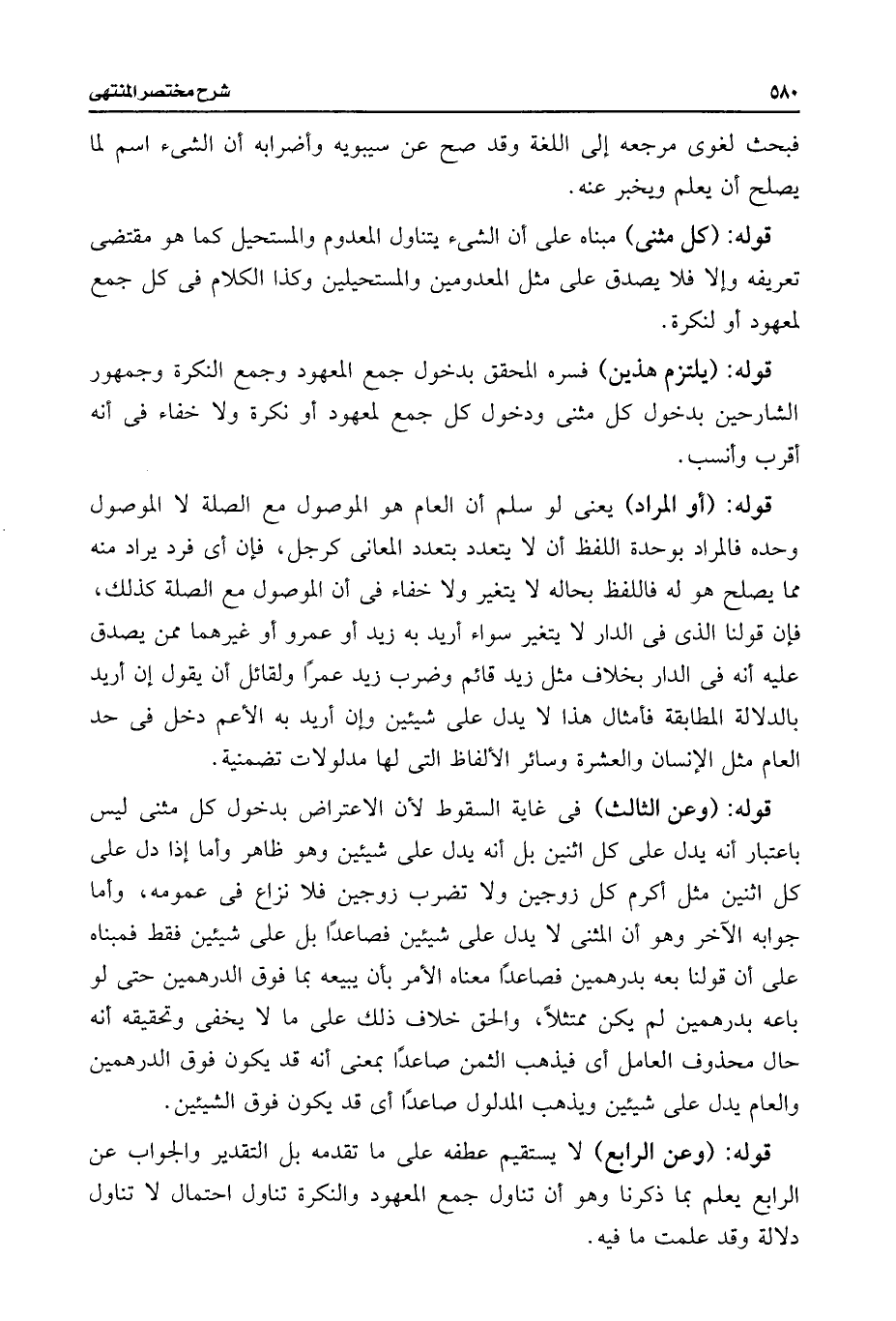 قوله: (وعن الثالث) فى غاية السقوط لأن الاعتراض بدخول كل مثنى ليس باعتبار أنه يدل على كل اثنين بل أنه يدل على شيئين وهو ظاهر وأما إذا دل على كل اثنين مثل أكرم كل زوجين ولا تضرب زوجين فلا نزاع فى عمومه، وأما جوابه الآخر وهو أن المثنى لا يدل على شيئين فصاعدًا بل على شيئين فقط فمبناه على أن قولنا بعه بدرهمين فصاعدًا معناه الأمر بأن يبيعه بما فوق الدرهمين حتى لو باعه بدرهمين لم يكن ممتثلًا، والحق خلاف ذلك على ما لا يخفى وتحقيقه أنه حال محذوف العامل أى فيذهب الثمن صاعدًا بمعنى أنه قد يكون فوق الدرهمين والعام يدل على شيئين ويذهب المدلول صاعدًا أى قد يكون فوق الشيئين.