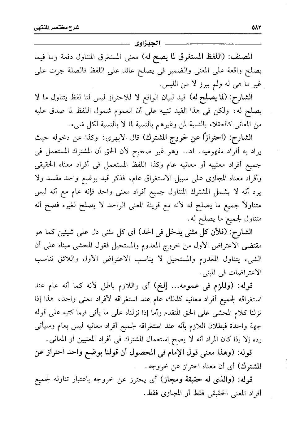 الشارح: (احترازًا عن خروج المشترك) قال الأبهرى: وكذا عن دخوله حيث يراد به أفراد مفهوميه. اهـ. وهو غير صحيح لأن الحق أن المشترك المستعمل فى جميع أفراد معنييه أو معانيه عام وكذا اللفظ المستعمل فى أفراد معناه الحقيقى وأفراد معناه المجازى على سبيل الاستغراق عام، فذكر قيد بوضع واحد مفسد ولا يرد أنه لا يشمل المشترك المتناول جميع أفراد معنى واحد فإنه عام مع أنه ليس متناولًا جميع ما يصلح له لأنه مع قرينة المعنى الواحد لا يصلح لغيره فصح أنه متناول لجميع ما يصلح له.