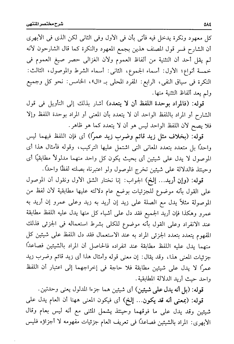 قوله: (بمعنى أنه قد يكون. . . إلخ) أى فيكون المعنى ههنا أن العام يدل على شيئين وقد يدل على ما فوقهما وحينئذ يشمل المثنى مع أنه ليس بعام وقال الأبهرى: المراد بالشيئين فصاعدًا فى تعريف العام جزئيات مفهومه لا أجزاؤه فليس