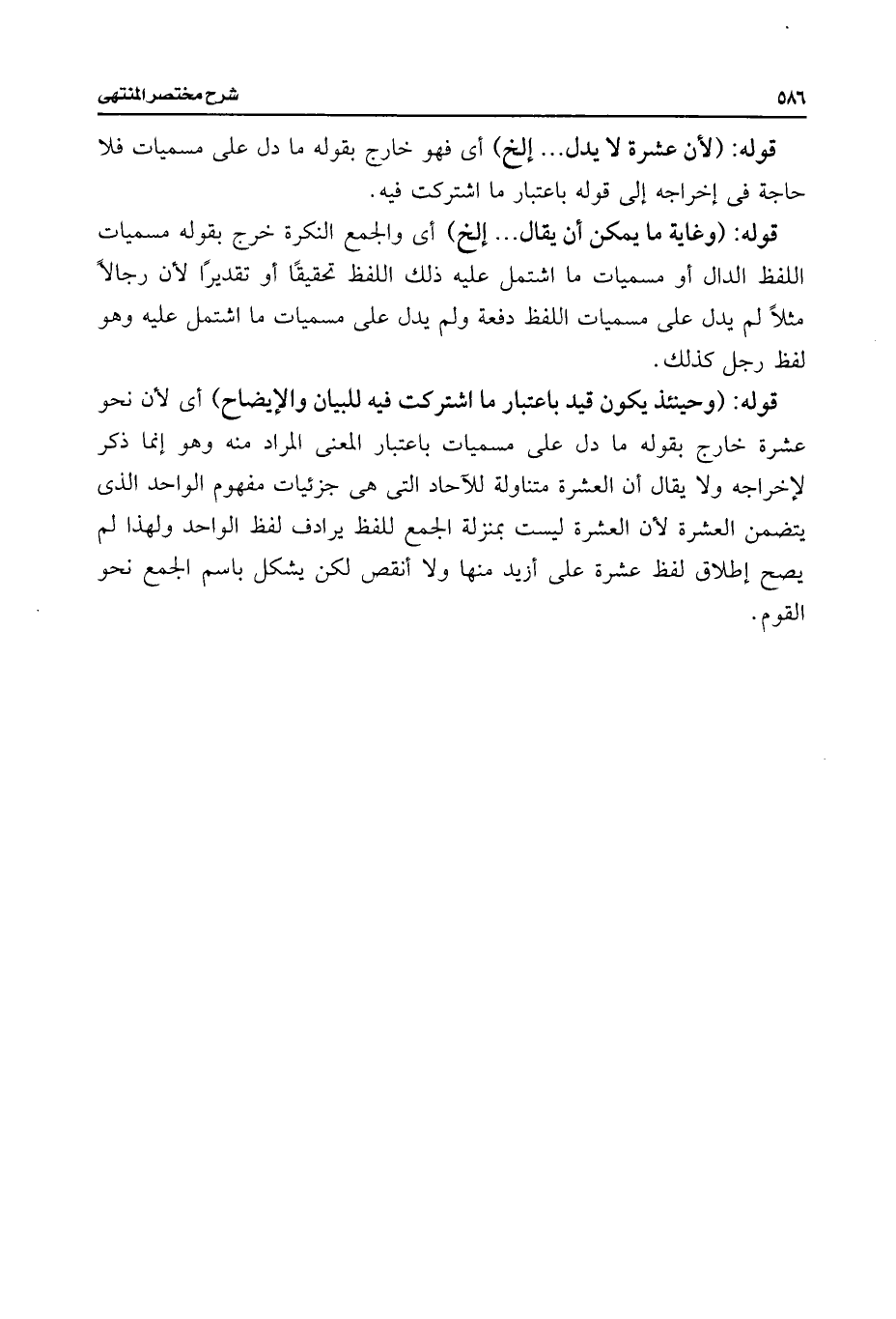قوله: (وحينئذ يكون قيد باعتبار ما اشتركت فيه للبيان والإيضاح) أى لأن نحو عشرة خارج بقوله ما دل على مسميات باعتبار المعنى المراد منه وهو إنما ذكر لإخراجه ولا يقال أن العمرة متناولة للآحاد التى هى جزئيات مفهوم الواحد الذى يتضمن العشرة لأن العشرة ليست بمنزلة الجمع للفظ يرادف لفظ الواحد ولهذا لم يصح إطلاق لفظ عشرة على أزيد منها ولا أنقص لكن يشكل باسم الجمع نحو القوم.