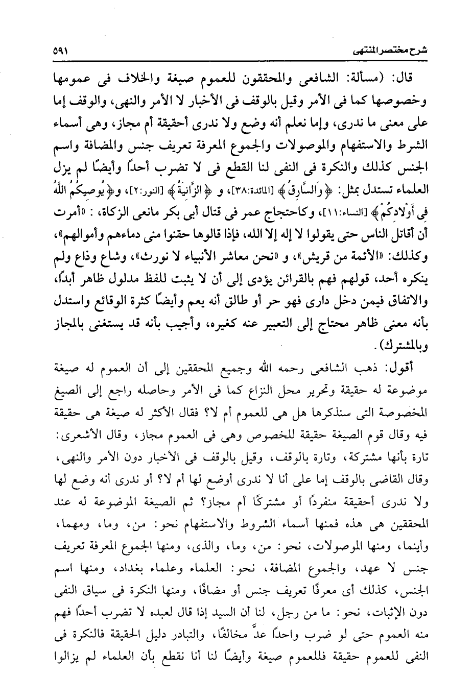 قال: (مسألة: الشافعى والمحققون للعموم صيغة والخلاف فى عمومها وخصوصها كما فى الأمر وقيل بالوقف فى الأخبار لا الأمر والنهى، والوقف إما على معنى ما ندرى، وإما نعلم أنه وضع ولا ندرى أحقيقة أم مجاز، وهى أسماء الشرط والاستفهام والموصولات والجموع المعرفة تعريف جنس والمضافة واسم الجنس كذلك والنكرة فى النفى لنا القطع فى لا تضرب أحدًا وأيضًا لم يزل العلماء تستدل بمثل: {وَالسَّارِقُ} [المائدة: ٣٨]، و {الزَّانِيَةُ} [النور: ٢]، و {يُوصِيكُمُ اللَّهُ فِي أَوْلَادِكُمْ} [النساء: ١١]، وكاحتجاج عمر فى قتال أبى بكر مانعى الزكاة: "أمرت أن أقاتل الناس حتى يقولوا لا إله إلا اللَّه، فإذا قالوها حقنوا منى دماءهم وأموالهم"، وكذلك: "الأئمة من قريش"، و"نحن معاشر الأنبياء لا نورث"، وشاع وذاع ولم ينكره أحد، قولهم فهم بالقرائن يؤدى إلى أن لا يثبت للفظ مدلول ظاهر أبدًا، والاتفاق فيمن دخل دارى فهو حر أو طالق أنه يعم وأيضًا كثرة الوقائع واستدل بأنه معنى ظاهر محتاج إلى التعبير عنه كغيره، وأجيب بأنه قد يستغنى بالمجاز وبالمشترك).
