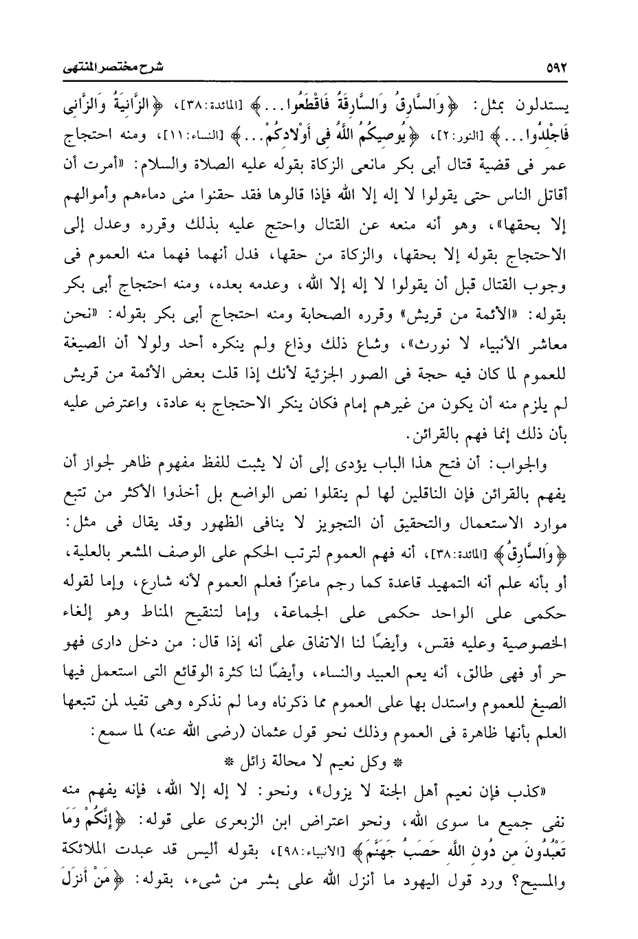 يستدلون بمثل: {وَالسَّارِقُ وَالسَّارِقَةُ فَاقْطَعُوا. . .} [المائدة: ٣٨]، {الزَّانِيَةُ وَالزَّانِي فَاجْلِدُوا. . .} [النور: ٢]، {يُوصِيكُمُ اللَّهُ فِي أَوْلَادِكُمْ. . .} [النساء: ١١]، ومنه احتجاج عمر فى قضية قتال أبى بكر مانعى الزكاة بقوله عليه الصلاة والسلام: "أمرت أن أقاتل الناس حتى يقولوا لا إله إلا اللَّه فإذا قالوها فقد حقنوا منى ماءهم وأموالهم إلا بحقها"، وهو أنه منعه عن القتال واحتج عليه بذلك وقرره وعدل إلى الاحتجاج بقوله إلا بحقها، والزكاة من حقها، فدل أنهما فهما منه العموم فى وجوب القتال قبل أن يقولوا لا إله إلا اللَّه، وعدمه بعده، ومنه احتجاج أبى بكر بقوله: "الأئمة من قريش" وقرره الصحابة ومنه احتجاج أبى بكر بقوله: "نحن معاشر الأنبياء لا نورث"، وشاع ذلك وذاع ولم ينكره أحد ولولا أن الصيغة للعموم لما كان فيه حجة فى الصور الجزئية لأنك إذا قلت بعض الأئمة من قريش لم يلزم منه أن يكون من غيرهم إمام فكان ينكر الاحتجاج به عادة، واعترض عليه بأن ذلك إنما فهم بالقرائن.