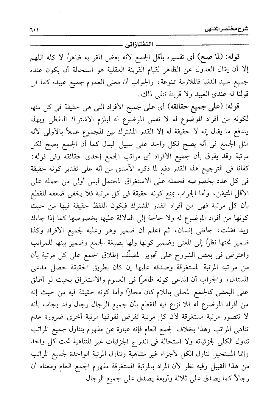قوله: (على جميع حقائقه) أى على جميع الأفراد التى هى حقيقة فى كل منها لكونه من أفراد الموضوع له لا نفس الموضوع له ليلزم الاشتراك اللفظى وبهذا يندفع ما يقال إنه لا حقيقة له إلا القدر المشترك بين المجموع عملًا بالأولى لأنه مثل الجمع فى أنه يصح لكل واحد على سبيل البدل كما أن الجمع يصح لكل مرتبة وقد يفرق بأن جميع الأفراد أى مراتب الجمع إحدى حقائقه وفى قوله: كفانا فى الترجيح هذا القدر دفع لما ذكره الآمدى من أنه على تقدير كونه حقيقة فى كل عدد بخصوصه فحمله على الاستغراق المحتمل ليس أولى من حمله على الأقل المتيقن، وأما الجواب بمنع كونه حقيقة فى كل مرتبة فلا يخفى ضعفه للقطع بأن كل مرتبة فهى من أفراد القدر المشترك فيكون اللفظ حقيقة فيها من حيث كونها من أفراد الموضوع له ولا حاجة إلى الدلالة عليها بخصوصها كما إذا جاءك زيد فقلت: جاءنى إنسان، ثم أعلم أن ضمير وهو وعليه لجميع الأفراد وكذا ضمير تحتها نظرًا إلى المعنى وضمير كونها ولها بصيغة الجمع وضمير بينها للمراتب واعترض فى بعض الشروح على تجويز المصنِّف إطلاق الجمع على كل مرتبة بأن من مراتبه المرتبة المستغرقة وصدقه عليها إن كان بطريق الحقيقة حصل مدعى المستدل، والجواب أن المدعى كونه ظاهرًا فى العموم والاستغراق بحيث لو أطلق على البعض كالجمع المحلى باللام كان مجازًا وأما كونه حقيقة فيه من حيث إنه من أفراد الموضوع له فلا نزاع فيه للقطع بأن جميع الرجال رجال وقد يجاب بأنه لا تتصور مرتبة مستغرقة لأن كل مرتبة تفرض ففوقها مرتبة أخرى ضرورة عدم تناهى المراتب وهذا بخلاف الجمع العام فإنه عبارة عن مفهوم يتناول جميع المراتب تناول الكلى لجزئياته ولا استحالة فى اندراج الجزئيات غير المتناهية تحت كل واحد وإنما المستحيل تناول الكل لأجزاء غير متناهية وتناول المرتبة الواحدة لجميع المراتب من هذا القبيل وفيه نظر لأن المراد بالمرتبة المستغرقة مفهوم الجمع العام ومعناه أن رجالًا كما يصدق على ثلاثة وأربعة يصدق على جميع الرجال.