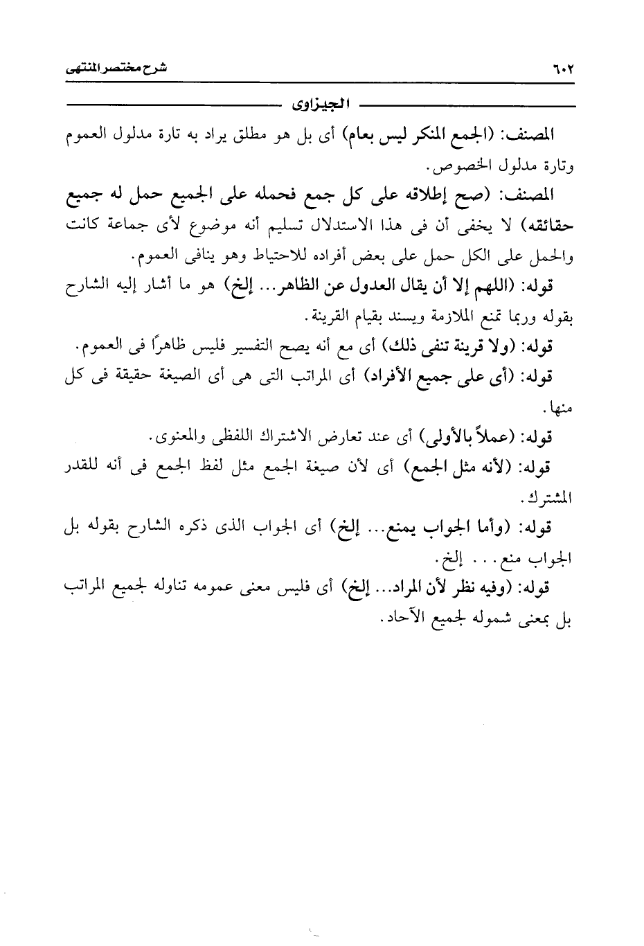 المصنف: (صح إطلاقه على كل جمع فحمله على الجميع حمل له جميع حقائقه) لا يخفى أن فى هذا الاستدلال تسليم أنه موضوع لأى جماعة كانت والحمل على الكل حمل على بعض أفراده للاحتياط وهو ينافى العموم.
