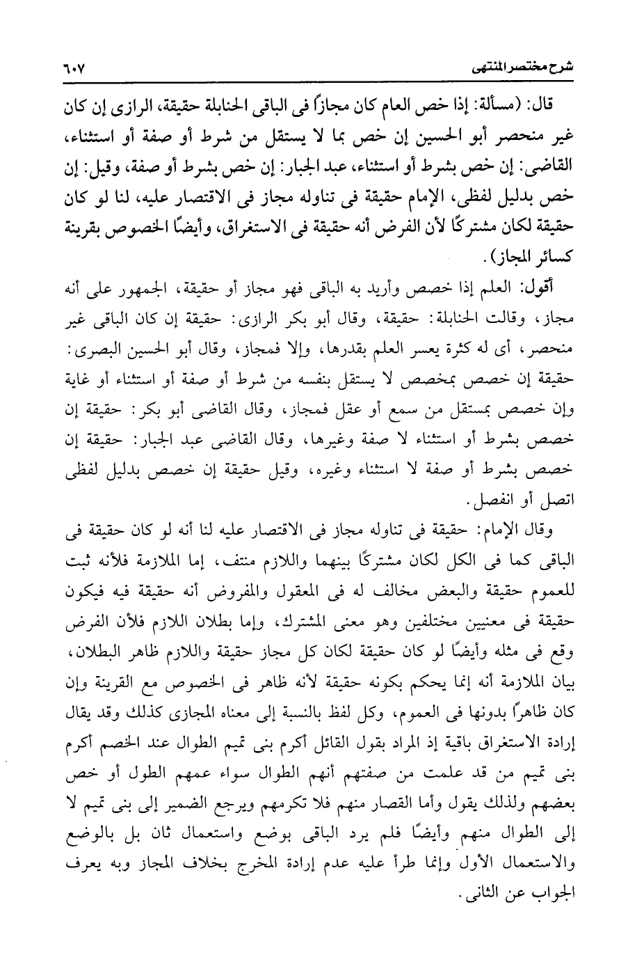 قال: (مسألة: إذا خص العام كان مجازًا فى الباقى الحنابلة حقيقة، الرازى إن كان غير منحصر أبو الحسين إن خص بما لا يستقل من شرط أو صفة أو استثناء، القاضى: إن خص بشرط أو استثناء، عبد الجبار: إن خص بشرط أو صفة، وقيل: إن خص بدليل لفظى، الإمام حقيقة فى تناوله مجاز فى الاقتصار عليه، لنا لو كان حقيقة لكان مشتركًا لأن الفرض أنه حقيقة فى الاستغراق، وأيضًا الخصوص بقرينة كسائر المجاز).