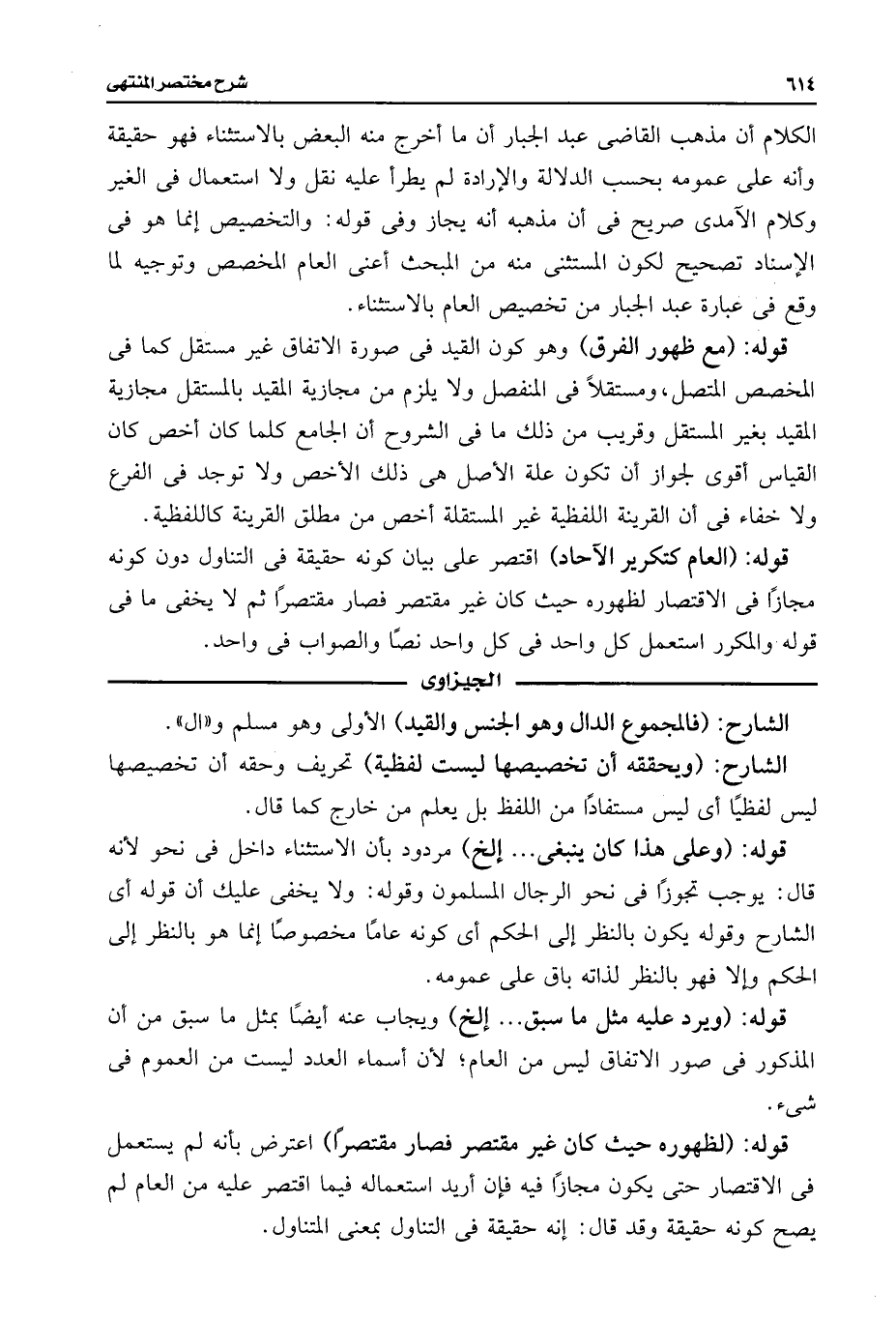 الكلام أن مذهب القاضى عبد الجبار أن ما أخرج منه البعض بالاستثناء فهو حقيقة وأنه على عمومه بحسب الدلالة والإرادة لم يطرأ عليه نقل ولا استعمال فى الغير وكلام الآمدى صريح فى أن مذهبه أنه يجاز وفى قوله: والتخصيص إنما هو فى الإسناد تصحيح لكون المستثنى منه من البحث أعنى العام المخصص وتوجيه لما وقع فى عبارة عبد الجبار من تخصيص العام بالاستثناء.