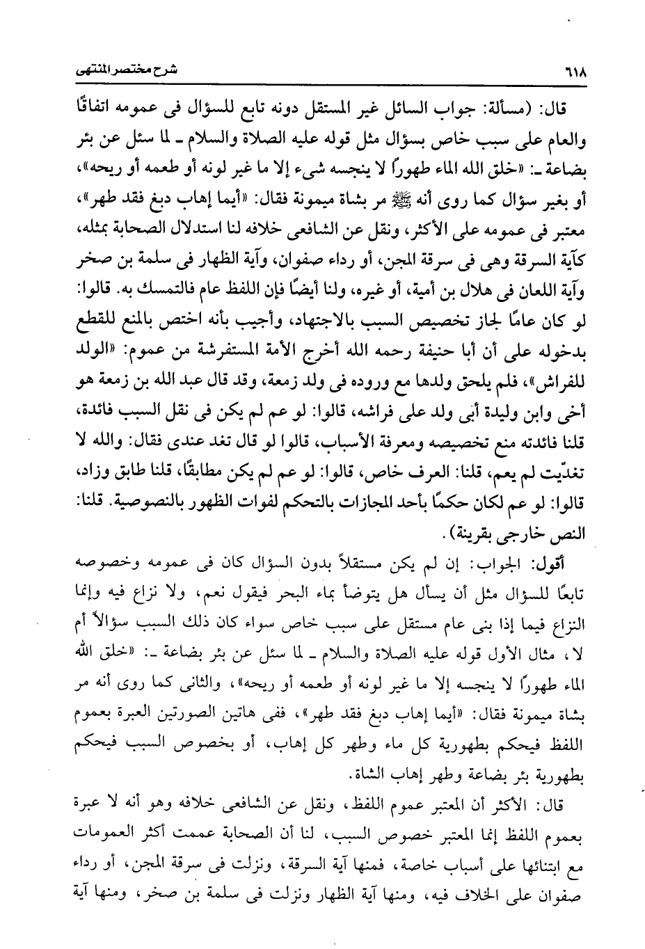قال: (مسألة: جواب السائل غير المستقل دونه تابع للسؤال فى عمومه اتفاقًا والعام على سبب خاص بسؤال مثل قوله عليه الصلاة والسلام -لما سئل عن بئر بضاعة-: "خلق اللَّه الماء طهورًا لا ينجسه شئ إلا ما غير لونه أو طعمه أو ريحه"، أو بغير سؤال كما روى أنه -صلى اللَّه عليه وسلم- مر بشاة ميمونة فقال: "أيما إهاب دبغ فقد طهر"، معتبر فى عمومه على الأكثر، ونقل عن الشافعى خلافه لنا استدلال الصحابة بمثله، كآية السرقة وهى فى سرقة المجن، أو رداء صفوان، وآية الظهار فى سلمة بن صخر وآية اللعان فى هلال بن أمية، أو غيره، ولنا أيضًا فإن اللفظ عام فالتمسك به. قالوا: لو كان عامًا لجاز تخصيص السبب بالاجتهاد، وأجيب بأنه اختص بالمنع للقطع بدخوله على أن أبا حنيفة رحمه اللَّه أخرج الأمة المستفرشة من عموم: "الولد للفراش"، فلم يلحق ولدها مع وروده فى ولد زمعة، وقد قال عبد اللَّه بن زمعة هو أخى وابن وليدة أبى ولد على فراشه، قالوا: لو عم لم يكن فى نقل السبب فائدة، قلنا فائدته منع تخصيصه ومعرفة الأسباب، قالوا لو قال تغد عندى فقال: واللَّه لا تغدّيت لم يعم، قلنا: العرف خاص، قالوا: لو عم لم يكن مطابقًا، قلنا طابق وزاد، قالوا: لو عم لكان حكمًا بأحد المجازات بالتحكم لفوات الظهور بالنصوصية. قلنا: النص خارجى بقرينة).
