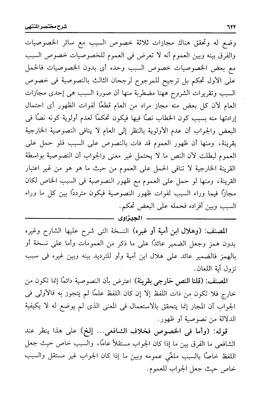 وضع له وتحقق هناك مجازات ثلاثة خصوص السبب مع سائر الخصوصيات والفرق بينه وبين العموم أنه لا تعرض فى العموم للخصوصيات خصوص السبب مع بعض الخصوصيات خصوص السبب وحده أى بدون الخصوصيات فالحمل على الأول تحكم بل ترجيح للمرجوح لرجحان الثالث بالنصوصية فى خصوص السبب وتقريرات الشروح ههنا مضطربة منها أن صورة السبب هى إحدى مجازات العام لأن كل بعض منه مجاز مراد من العام قطعًا لفوات الظهور أى احتمال إرادتها منه بسبب كون الخطاب نصًا فيها فيكون تحكمًا لعدم أولوية كونه نصًا فى البعض والجواب أن عدم الأولوية بالنظر إلى العام لا ينافى النصوصية الخارجية بقرينة، ومنها أن ظهور العموم قد فات بالنصوص على السبب فلو حمل على العموم لبطلت لأن النص ما لا يحتمل غير معنى والجواب أن النصوصية بواسطة القرينة الخارجية لا تنافى الحمل على العموم من حيث ما هو هو من غير اعتبار القرينة، ومنها لو حمل على العموم مع ظهور النصوصية فى السبب الخاص لكان مجازًا فيما وراء السبب لفوات ظهور النصوصية فيكون مترددًا بين كل ما وراء السبب وبين أفراده فحمله على البعض تحكم.