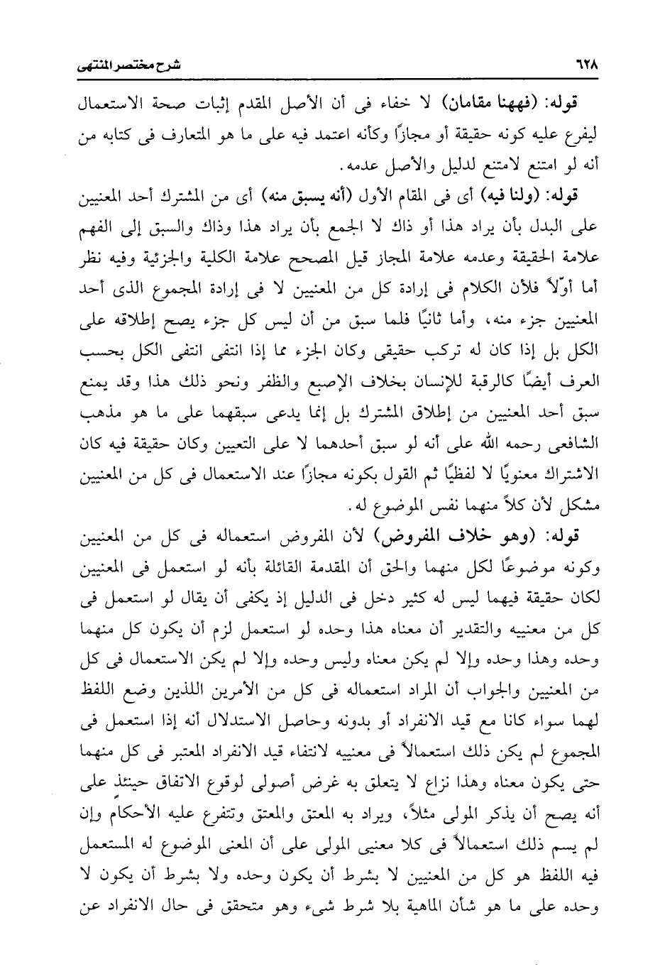 قوله: (وهو خلاف المفروض) لأن المفروض استعماله فى كل من المعنيين وكونه موضوعًا لكل منهما والحق أن المقدمة القائلة بأنه لو استعمل فى المعنيين لكان حقيقة فيهما ليس له كثير دخل فى الدليل إذ يكفى أن يقال لو استعمل فى كل من معنييه والتقدير أن معناه هذا وحده لو استعمل لزم أن يكون كل منهما وحده وهذا وحده وإلا لم يكن معناه وليس وحده وإلا لم يكن الاستعمال فى كل من المعنيين والجواب أن المراد استعماله فى كل من الأمرين اللذين وضع اللفظ لهما سواء كانا مع قيد الانفراد أو بدونه وحاصل الاستدلال أنه إذا استعمل فى المجموع لم يكن ذلك استعمالًا فى معنييه لانتفاء قيد الانفراد المعتبر فى كل منهما حتى يكون معناه وهذا نزاع لا يتعلق به غرض أصولى لوقوع الاتفاق حينئذٍ على أنه يصح أن يذكر المولى مثلًا، ويراد به المعتق والمعتق وتتفرع عليه الأحكام وإن لم يسم ذلك استعمالًا فى كلا معنيى المولى على أن المعنى الموضوع له المستعمل فيه اللفظ هو كل من المعنيين لا بشرط أن يكون وحده ولا بشرط أن يكون لا وحده على ما هو شأن الماهية بلا شرط شئ وهو متحقق فى حال الانفراد عن