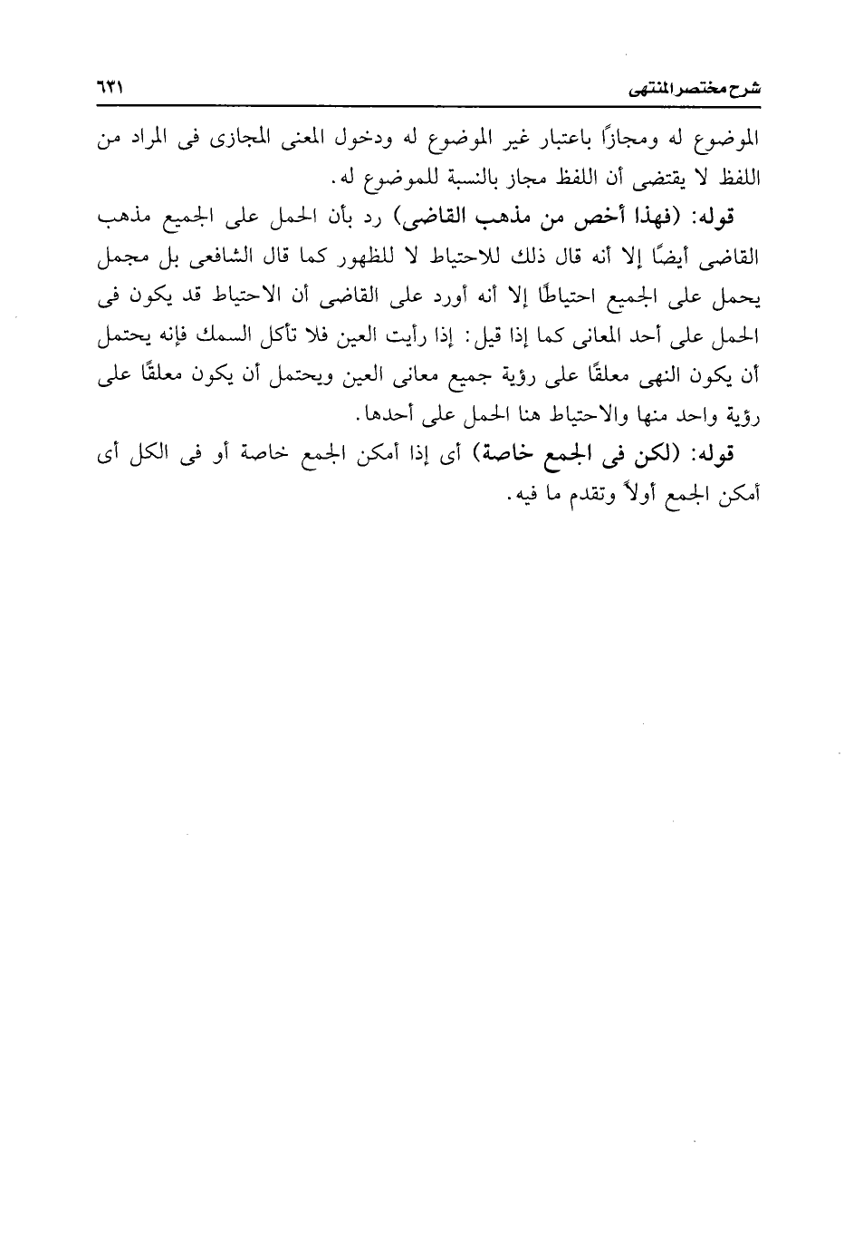 قوله: (فهذا أخص من مذهب القاضى) رد بأن الحمل على الجميع مذهب القاضى أيضًا إلا أنه قال ذلك للاحتياط لا للظهور كما قال الشافعى بل مجمل يحمل على الجميع احتياطًا إلا أنه أورد على القاضى أن الاحتياط قد يكون فى الحمل على أحد المعانى كما إذا قيل: إذا رأيت العين فلا تأكل السمك فإنه يحتمل أن يكون النهى معلقًا على رؤية جميع معانى العين ويحتمل أن يكون معلقًا على رؤية واحد منها والاحتياط هنا الحمل على أحدها.