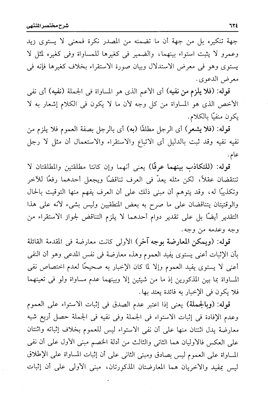 قوله: (ويمكن المعارضة بوجه آخر) الأولى كانت معارضة فى المقدمة القائلة بأن الإثبات أعنى يستوى يفيد العموم وهذه معارضة فى نفس المدعى وهو أن النفى أعنى لا يستوى يفيد العموم وإلا لما كان الإخبار به صحيحًا لعدم اختصاص نفى المساواة بما بين المذكورين إذ ما من شيئين إلا وبينهما عدم مساواة ولو فى تعينهما فلا يكون فى الإخبار به فائدة يعتد بها.