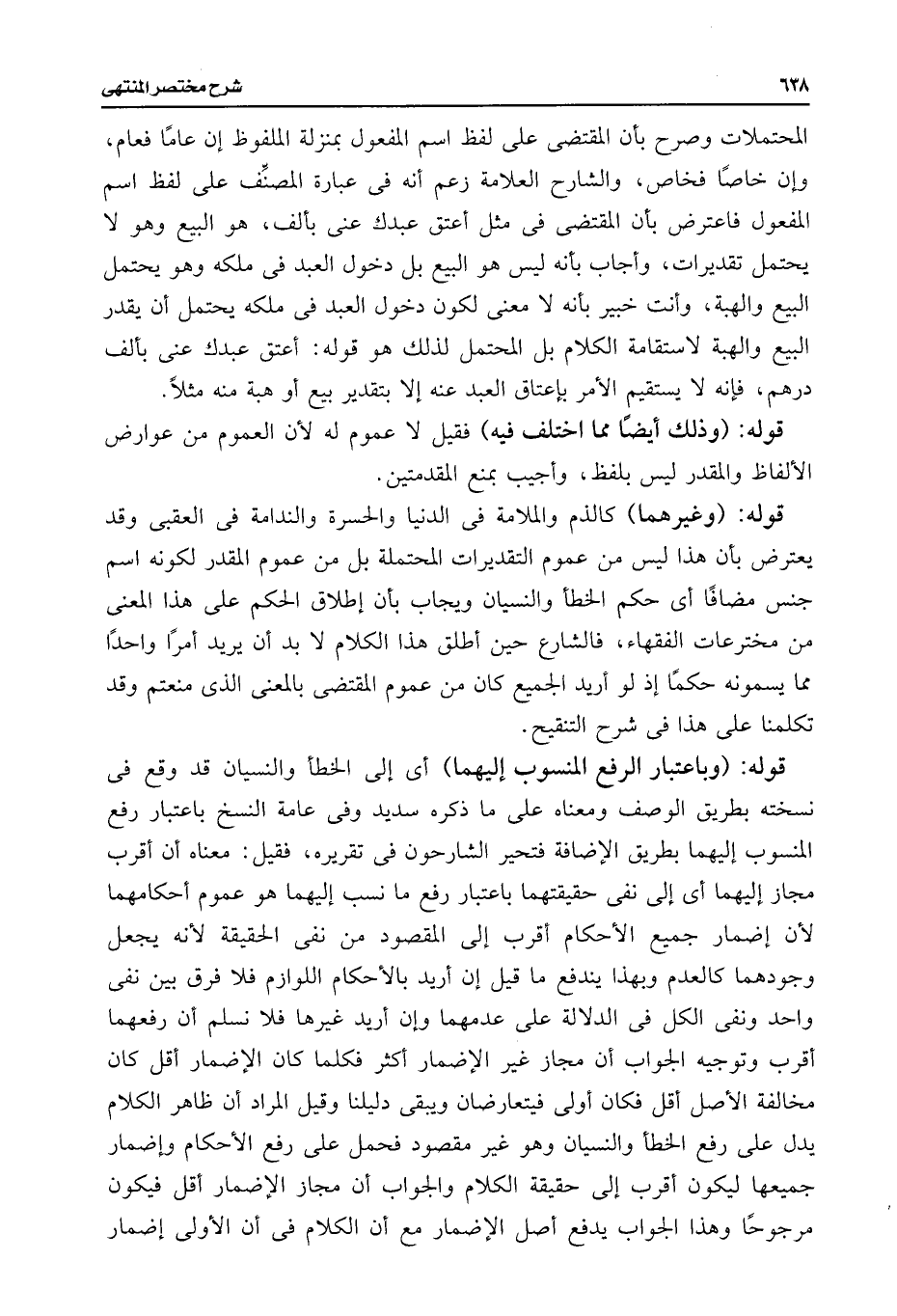 المحتملات وصرح بأن المقتضى على لفظ اسم المفعول بمنزلة الملفوظ إن عامًا فعام، وإن خاصًا فخاص، والشارح العلامة زعم أنه فى عبارة المصنِّف على لفظ اسم المفعول فاعترض بأن المقتضى فى مثل أعتق عبدك عنى بألف، هو البيع وهو لا يحتمل تقديرات، وأجاب بأنه ليس هو البيع بل دخول العبد فى ملكه وهو يحتمل البيع والهبة، وأنت خبير بأنه لا معنى لكون دخول العبد فى ملكه يحتمل أن يقدر البيع والهبة لاستقامة الكلام بل المحتمل لذلك هو قوله: أعتق عبدك عنى بألف درهم، فإنه لا يستقيم الأمر بإعتاق العبد عنه إلا بتقدير بيع أو هبة منه مثلًا.