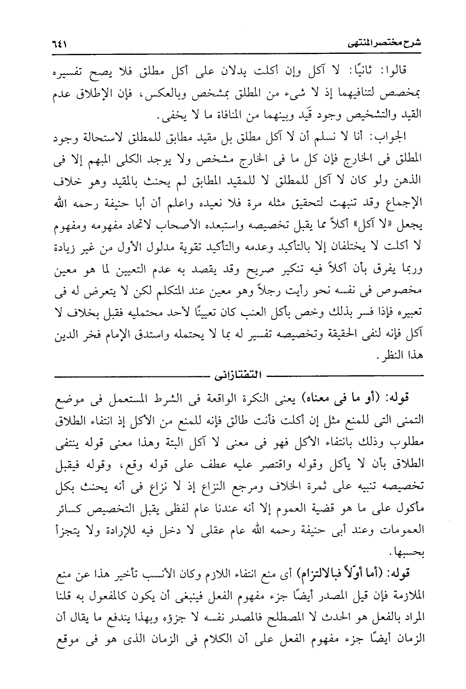 قالوا: ثانيًا: لا آكل وإن أكلت يدلان على أكل مطلق فلا يصح تفسيره بمخصص لتنافيهما إذ لا شئ من المطلق بمشخص وبالعكس، فإن الإطلاق عدم القيد والتشخيص وجود قَيد وبينهما من المنافاة ما لا يخفى.