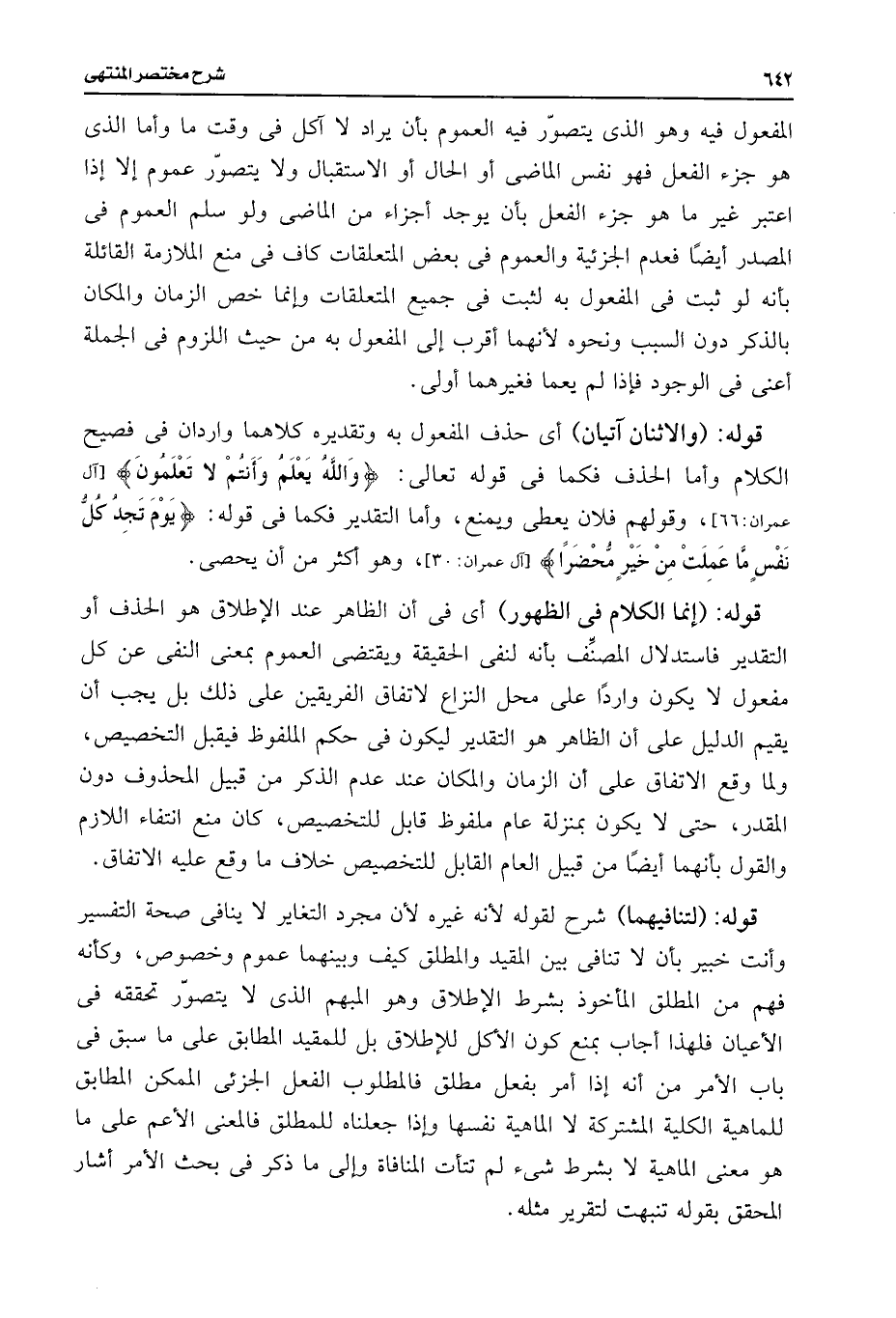 المفعول فيه وهو الذى يتصوّر فيه العموم بأن يراد لا آكل فى وقت ما وأما الذى هو جزء الفعل فهو نفس الماضى أو الحال أو الاستقبال ولا يتصوّر عموم إلا إذا اعتبر غير ما هو جزء الفعل بأن يوجد أجزاء من الماضى ولو سلم العموم فى المصدر أيضًا فعدم الجزئية والعموم فى بعض المتعلقات كاف فى منع الملازمة القائلة بأنه لو ثبت فى المفعول به لثبت فى جميع المتعلقات وإنما خص الزمان والمكان بالذكر دون السبب ونحوه لأنهما أقرب إلى المفعول به من حيث اللزوم فى الجملة أعنى فى الوجود فإذا لم يعما فغيرهما أولى.