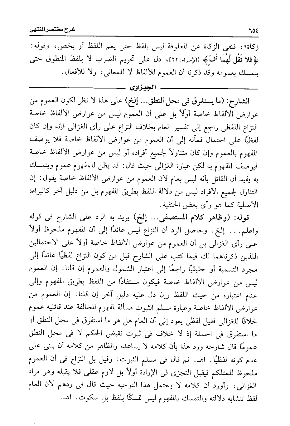 الشارح: (ما يستغرق فى محل النطق. . . إلخ) على هذا لا نظر لكون العموم من عوارض الألفاظ خاصة أوّلًا بل على أن العموم ليس من عوارض الألفاظ خاصة النزاع اللفظى راجع إلى تفسير العام بخلاف النزاع على رأى الغزالى فإنه وإن كان لفظيًا على احتمال فمآله إلى أن العموم من عوارض الألفاظ خاصة فلا يوصف المفهوم بالعموم وإن كان متناولَا لجميع أفراده أو ليس من عوارض الألفاظ خاصة فيوصف المفهوم به لكن عبارة الغزالى حيث قال: قد يظن للمفهوم عموم ويتمسك به يفيد أن القائل بأنه ليس بعام لأن العموم من عوارض الألفاظ خاصة يقول: إن التناول لجميع الأفراد ليس من دلالة اللفظ بطريق المفهوم بل من دليل آخر كالبراءة الأصلية كما هو رأى بعض الحنفية.