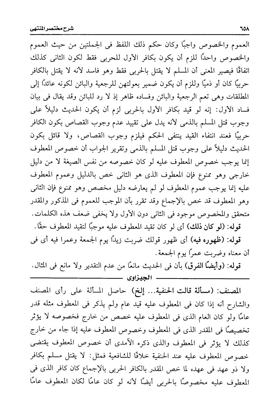 العموم والخصوص واجبًا وكان حكم ذلك اللفظ فى الجملتين من حيث العموم والخصوص واحدًا للزم أن يكون بكافر الأول للحربى فقط لكون الثانى كذلك اتفاقًا فيصير المعنى أن المسلم لا يقتل بالحربى فقط وهو فاسد لأنه لا يقتل بالكافر حربيًا كان أو ذميًا وللزم أن يكون ضمير بعولتهن للرجعية والبائن لكونه عائدًا إلى المطلقات وهى تعم الرجعية والبائن وفساده ظاهر إذ لا رد للبائن وقد يقال فى بيان فساد الأول: إنه لو قيد بكافر الأول بالحربى لزم أن بكون الحديث دليلًا على وجوب قتل المسلم بالذمى لأنه يدل على تقييد عدم وجوب القصاص بكون الكافر حربيًا فعند انتفاء القيد ينتفى الحكم فيلزم وجوب القصاص، ولا قائل بكون الحديث دليلًا على وجوب قتل المسلم بالذمى وتقرير الجواب أن خصوص المعطوف إنما يوجب خصوص المعطوف عليه لو كان خصوصه من نفس الصيغة لا من دليل خارجى وهو ممنوع فإن المعطوف الذى هو الثانى خص بالدليل وعموم المعطوف عليه إنما يوجب عموم المعطوف لو لم يعارضه دليل مخصص وهو ممنوع فإن الثانى وهو المعطوف قد خص بالإجماع وقد تقرر بأن الموجب للعموم فى المذكور والمقدر متحقق والمخصوص موجود فى الثانى دون الأول ولا يخفى ضعف هذه الكلمات.
