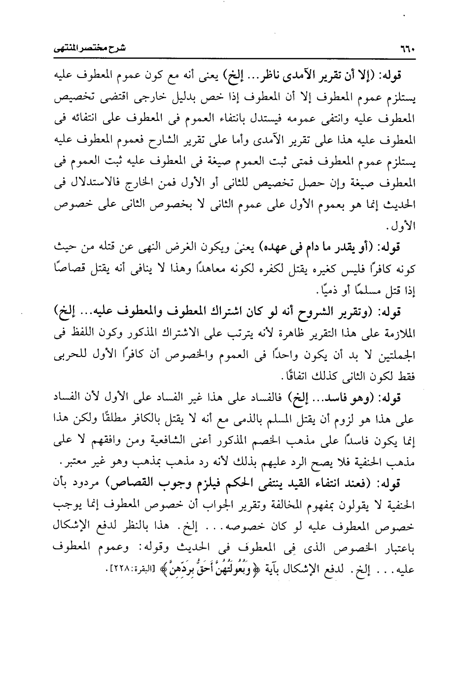 قوله: (فعند انتفاء القيد ينتفى الحكم فيلزم وجوب القصاص) مردود بأن الحنفية لا يقولون بمفهوم المخالفة وتقرير الجواب أن خصوص المعطوف إنما يوجب خصوص المعطوف عليه لو كان خصوصه. . . إلخ. هذا بالنظر لدفع الإشكال باعتبار الخصوص الذى فى المعطوف فى الحديث وقوله: وعموم المعطوف عليه. . . إلخ. لدفع الإشكال بآية {وَبُعُولَتُهُنَّ أَحَقُّ بِرَدِّهِنَّ} [البقرة: ٢٢٨].