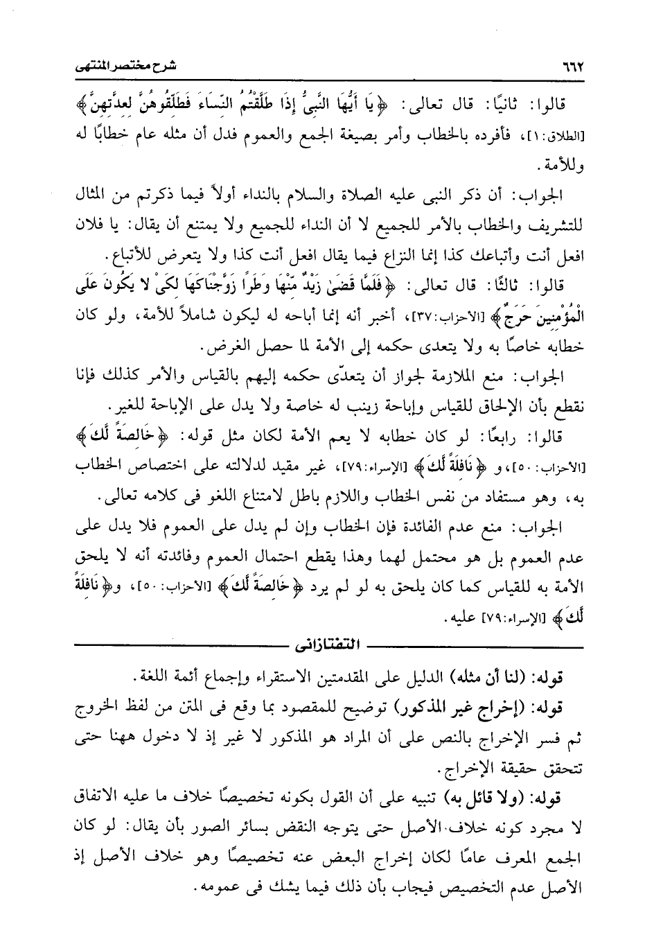 قالوا: رابعًا: لو كان خطابه لا يعم الأمة لكان مثل قوله: {خَالِصَةً لَكَ} [الأحزاب: ٥٠]، و {نَافِلَةً لَكَ} [الإسراء: ٧٩]، غير مقيد لدلالته على اختصاص الخطاب به، وهو مستفاد من نفس الخطاب واللازم باطل لامتناع اللغو فى كلامه تعالى.