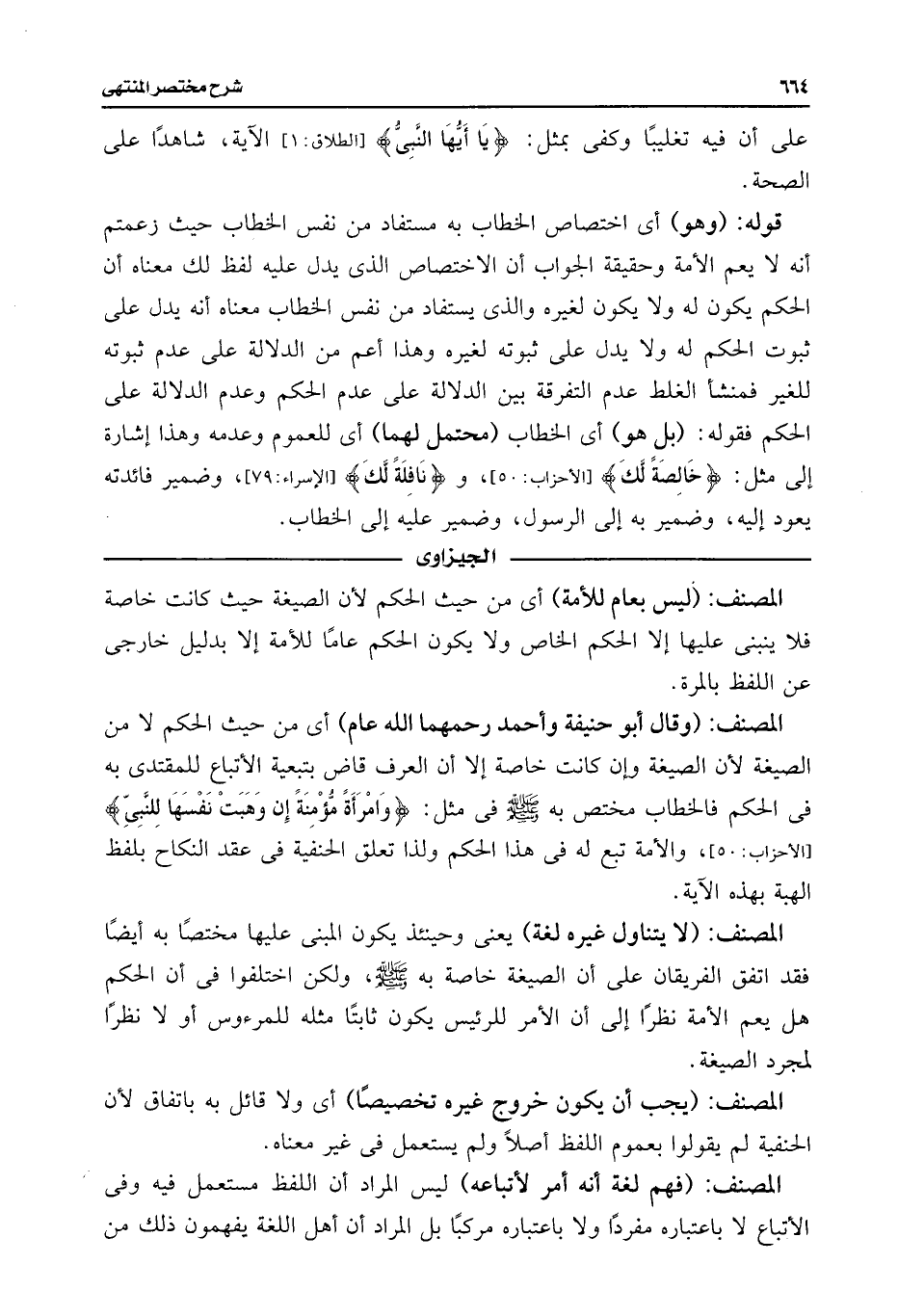 المصنف: (وقال أبو حنيفة وأحمد رحمهما اللَّه عام) أى من حيث الحكم لا من الصيغة لأن الصيغة وإن كانت خاصة إلا أن العرف قاض بتبعية الأتباع للمقتدى به فى الحكم فالخطاب مختص به -صلى اللَّه عليه وسلم- فى مثل: {وَامْرَأَةً مُؤْمِنَةً إِنْ وَهَبَتْ نَفْسَهَا لِلنَّبِيِّ} [الأحزاب: ٥٠]، والأمة تبع له فى هذا الحكم ولذا تعلق الحنفية فى عقد النكاح بلفظ الهبة بهذه الآية.