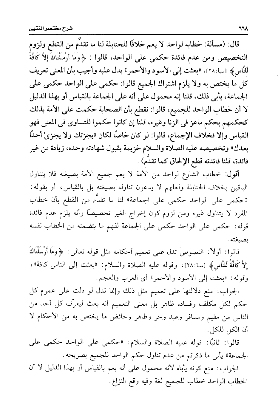 قال: (مسألة: خطابه لواحد لا يعم خلافًا للحنابلة لنا ما تقدَّم من القطع ولزوم التخصيص ومن عدم فائدة حكمى على الواحد، قالوا: {وَمَا أَرْسَلْنَاكَ إِلَّا كَافَّةً لِلنَّاسِ} [سبأ: ٢٨]، "بعثت إلى الأسود والأحمر" يدل عليه وأجيب بأن المعنى تعريف كل ما يختص به ولا يلزم اشتراك الجميع قالوا: حكمى على الواحد حكمى على الجماعة، يأبى ذلك، قلنا إنه محمول على أنه على الجماعة بالقياس أو بهذا الدليل لا أن خطاب الواحد للجميع، قالوا: نقطع بأن الصحابة حكمت على الأمة بذلك كحكمهم بحكم ماعز فى الزنا وغيره، قلنا إن كانوا حكموا للتساوى فى المعنى فهو القياس وإلا فخلاف الإجماع، قالوا: لو كان خاصًا لكان "يجزئك ولا يجزئ أحدًا بعدك" وتخصصه عليه الصلاة والسلام خزيمة بقبول شهادته وحده، زيادة من غير فائدة، قلنا فائدته قطع الإلحاق كما تقدَّم).