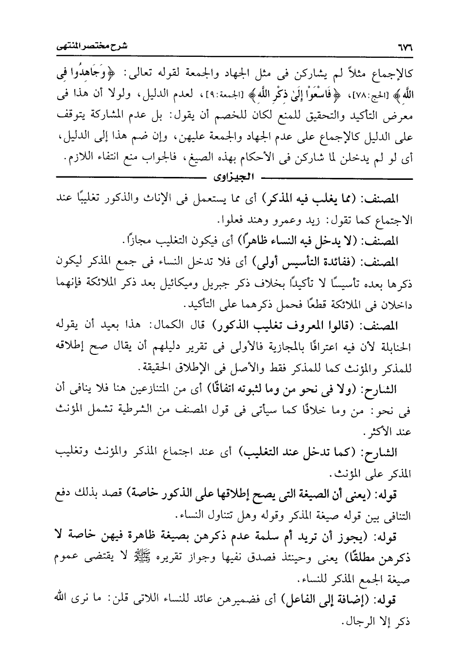 المصنف: (قالوا العروف تغليب الذكور) قال الكمال: هذا بعيد أن يقوله الحنابلة لأن فيه اعترافًا بالمجازية فالأولى فى تقرير دليلهم أن يقال صح إطلاقه للمذكر والمؤنث كما للمذكر فقط والأصل فى الإطلاق الحقيقة.