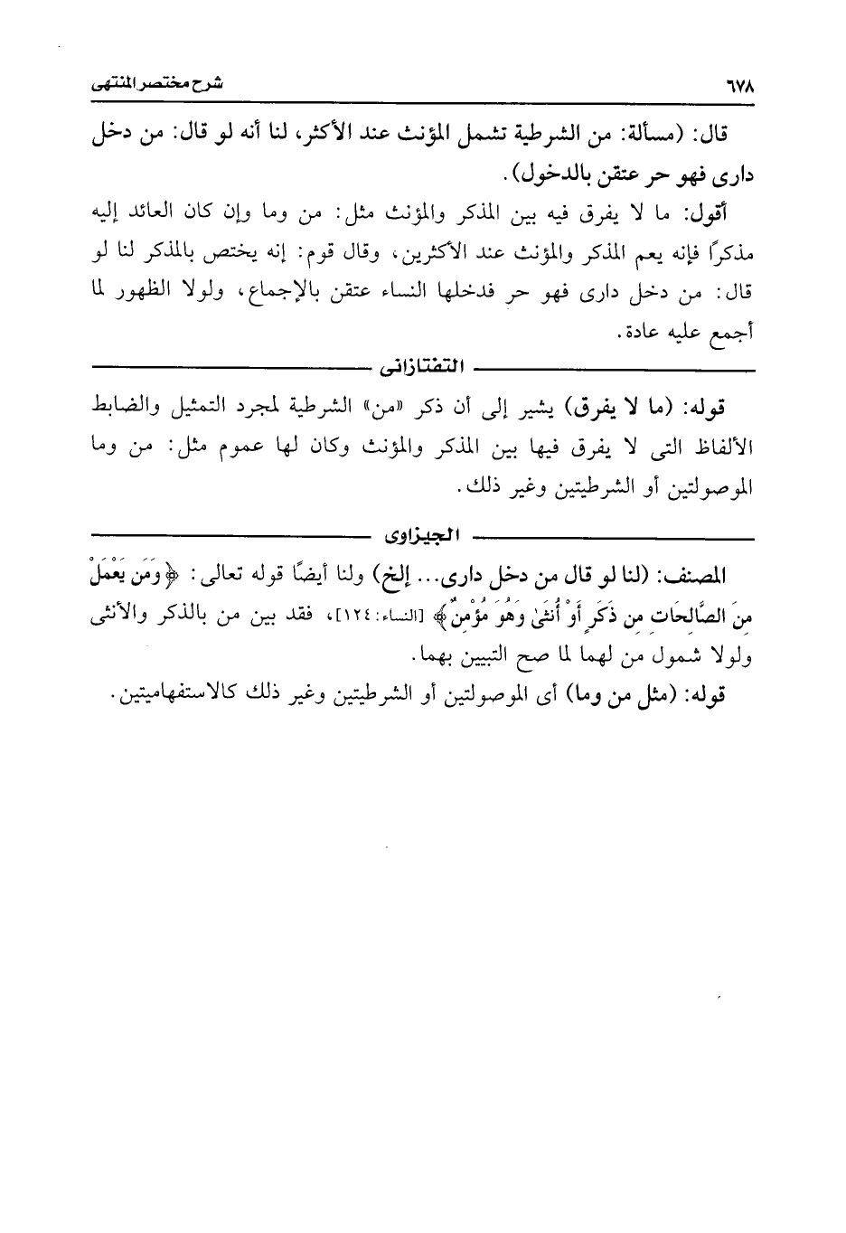 أقول: ما لا يفرق فيه بين المذكر والؤنث مثل: من وما وإن كان العائد إليه مذكرًا فإنه يعم المذكر والمؤنث عند الأكثرين، وقال قوم: إنه يختص بالمذكر لنا لو قال: من دخل دارى فهو حر فدخلها النساء عتقن بالإجماع، ولولا الظهور لما أجمع عليه عادة.