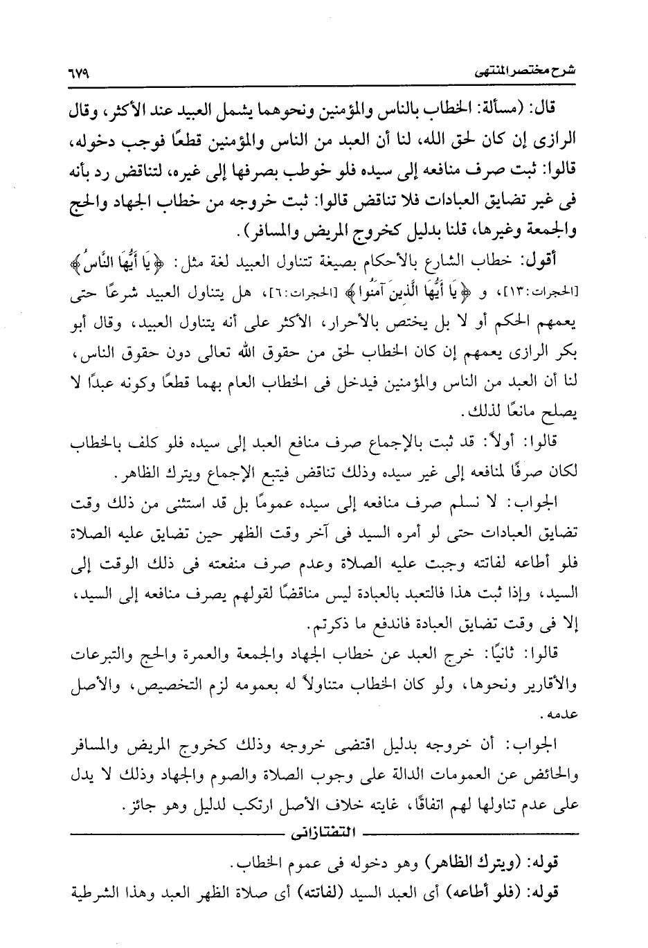 قال: (مسألة: الخطاب بالناس والمؤمنين ونحوهما يشمل العبيد عند الأكثر، وقال الرازى إن كان لحق اللَّه، لنا أن العبد من الناس والمؤمنين قطعًا فوجب دخوله، قالوا: ثبت صرف منافعه إلى سيده فلو خوطب بصرفها إلى غيره، لتناقض رد بأنه فى غير تضايق العبادات فلا تناقض قالوا: ثبت خروجه من خطاب الجهاد والحج والجمعة وغيرها، قلنا بدليل كخروج المريض والمسافر).