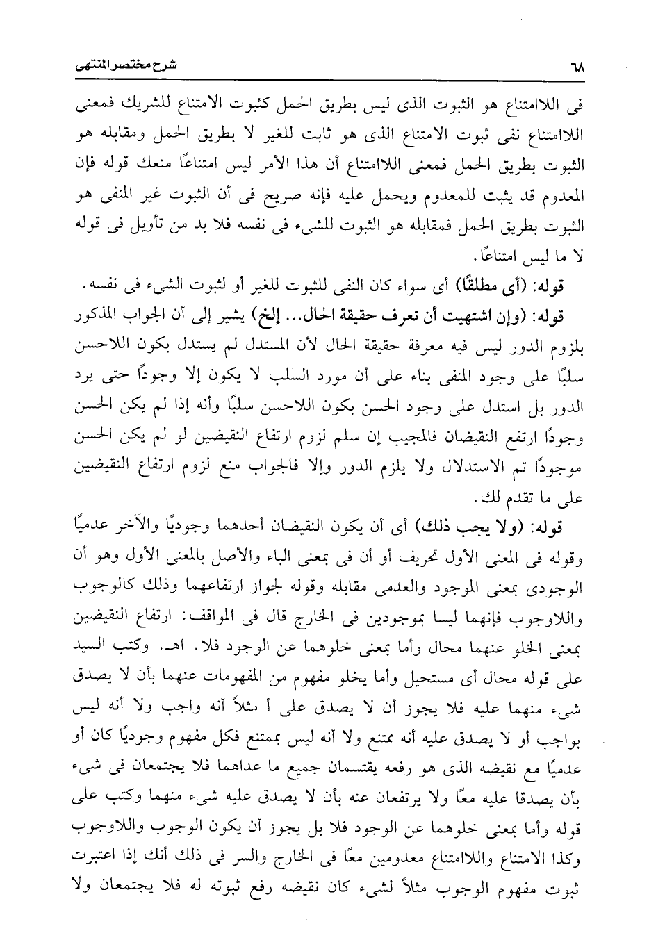 فى اللاامتناع هو الثبوت الذى ليس بطريق الحمل كثبوت الامتناع للشريك فمعنى اللاامتناع نفى ثبوت الامتناع الذى هو ثابت للغير لا بطريق الحمل ومقابله هو الثبوت بطريق الحمل فمعنى اللاامتناع أن هذا الأمر ليس امتناعًا منعك قوله فإن المعدوم قد يثبت للمعدوم ويحمل عليه فإنه صريح فى أن الثبوت غير المنفى هو الثبوت بطريق الحمل فمقابله هو الثبوت للشئ فى نفسه فلا بد من تأويل فى قوله لا ما ليس امتناعًا.