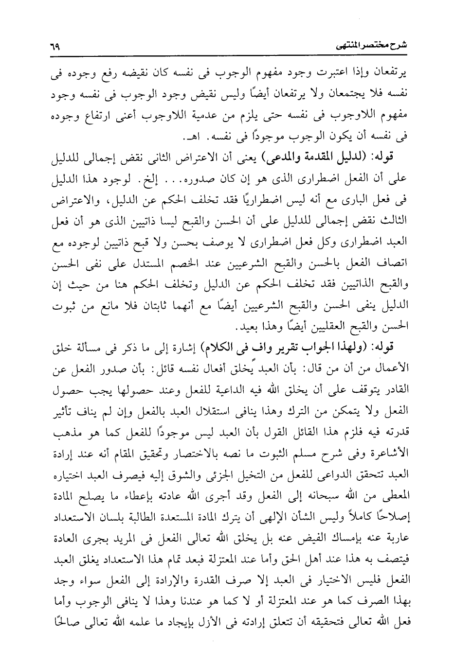قوله: (ولهذا الجواب تقرير وافٍ فى الكلام) إشارة إلى ما ذكر فى مسألة خلق الأعمال من أن من قال: بأن العبد يخلق أفعال نفسه قائل: بأن صدور الفعل عن القادر يتوقف على أن يخلق اللَّه فيه الداعية للفعل وعند حصولها يجب حصول الفعل ولا يتمكن من الترك وهذا ينافى استقلال العبد بالفعل كان لم يناف تأثير قدرته فيه فلزم هذا القائل القول بأن العبد ليس موجودًا للفعل كما هو مذهب الأشاعرة وفى شرح مسلم الثبوت ما نصه بالاختصار وتحقيق المقام أنه عند إرادة العبد تتحقق الدواعى للفعل من التخيل الجزئى والشوق إليه فيصرف العبد اختياره المعطى من اللَّه سبحانه إلى الفعل وقد أجرى اللَّه عادته بإعطاء ما يصلح المادة إصلاحًا كاملًا وليس الشأن الإلهى أن يترك المادة المستعدة الطالبة بلسان الاستعداد عاربة عنه بإمساك الفيض عنه بل يخلق اللَّه تعالى الفعل فى المريد بجرى العادة فيتصف به هذا عند أهل الحق وأما عند المعتزلة فبعد تمام هذا الاستعداد يغلق العبد الفعل فليس الاختيار فى العبد إلا صرف القدرة والإرادة إلى الفعل سواء وجد بهذا الصرف كما هو عند المعتزلة أو لا كما هو عندنا وهذا لا ينافى الوجوب وأما فعل اللَّه تعالى فتحقيقه أن تتعلق إرادته فى الأزل بإيجاد ما علمه اللَّه تعالى صالحًا