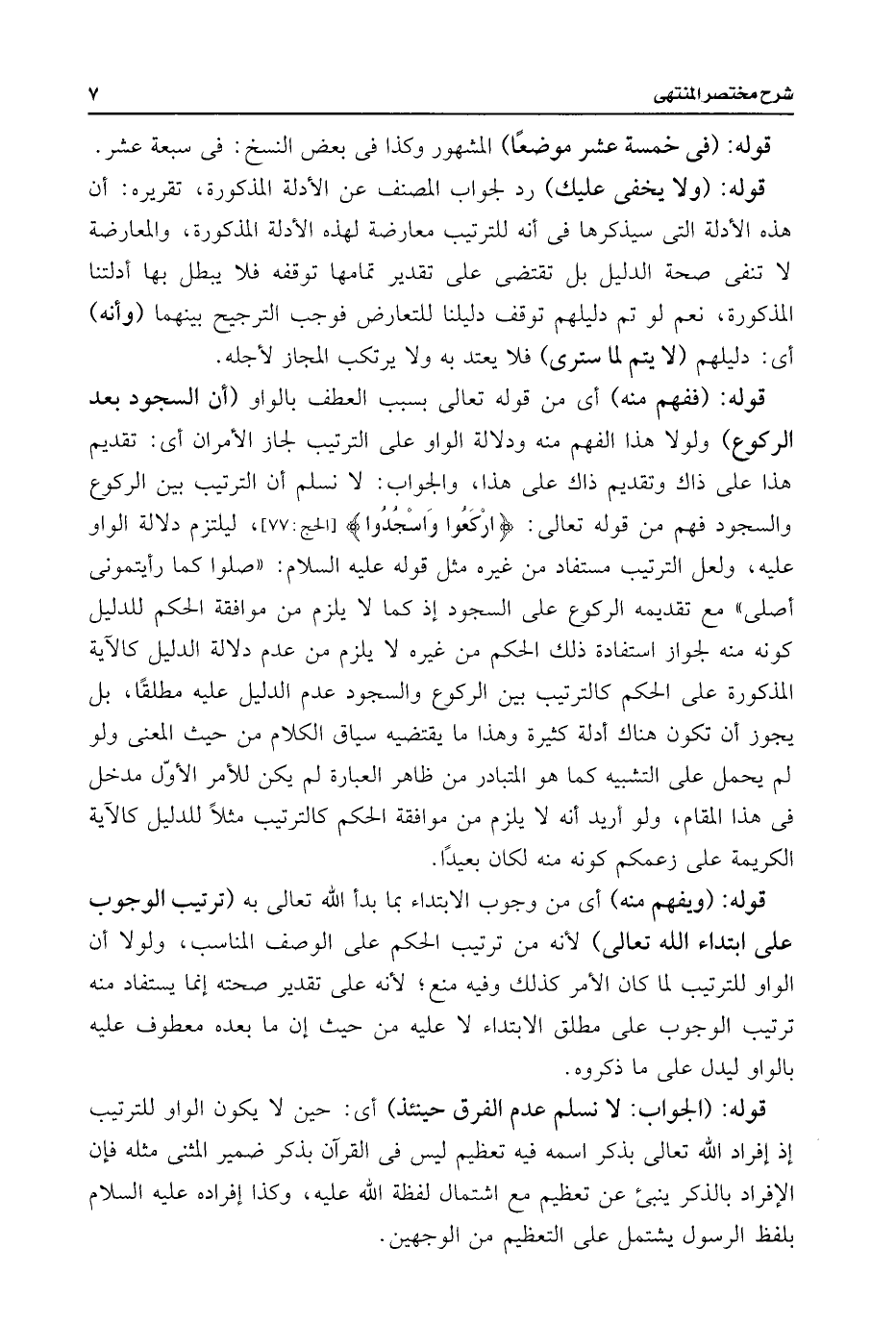 قوله: (ففهم منه) أى من قوله تعالى بسبب العطف بالواو (أن السجود بعد الركوع) ولولا هذا الفهم منه ودلالة الواو على الترتيب لجاز الأمران أى: تقديم هذا على ذاك وتقديم ذاك على هذا، والجواب: لا نسلم أن الترتيب بين الركوع والسجود فهم من قوله تعالى: {ارْكَعُوا وَاسْجُدُوا} [الحج: ٧٧]، ليلتزم دلالة الواو عليه، ولعل الترتيب مستفاد من غيره مثل قوله عليه السلام: "صلوا كما رأيتمونى أصلى" مع تقديمه الركوع على السجود إذ كما لا يلزم من موافقة الحكم للدليل كونه منه لجواز استفادة ذلك الحكم من غيره لا يلزم من عدم دلالة الدليل كالآية المذكورة على الحكم كالترتيب بين الركوع والسجود عدم الدليل عليه مطلقًا، بل يجوز أن تكون هناك أدلة كثيرة وهذا ما يقتضيه سياق الكلام من حيث المعنى ولو لم يحمل على التشبيه كما هو التبادر من ظاهر العبارة لم يكن للأمر الأوّل مدخل فى هذا المقام، ولو أريد أنه لا يلزم من موافقة الحكم كالترتيب مثلًا للدليل كالآية الكريمة على زعمكم كونه منه لكان بعيدًا.