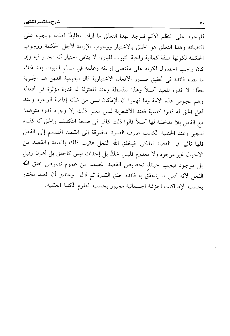 للوجود على النظم الأتم فيوجد بهذا التعلق ما أراده مطابقًا لعلمه ويجب على اقتضائه وهذا التعلق هو الخلق بالاختيار ووجوب الإرادة لأجل الحكمة ووجوب الحكمة لكونها صفة كمالية واجبة الثبوت للبارى لا ينافى اختيار أنه مختار فيه وإن كان واجب الحصول لكونه على مقتضى إرادته وعلمه فى مسلم الثبوت بعد ذلك ما نصه فائدة فى تحقيق صدور الأفعال الاختيارية قال الجهمية الذين هم الجبرية حقًا: لا قدرة للعبد أصلًا وهذا سفسطة وعند المعتزلة له قدرة مؤثرة فى أفعاله وهم مجوس هذه الأمة وما فهموا أن الإمكان ليس من شأنه إفاضة الوجود وعند أهل الحق له قدرة كاسبة فعند الأشعرية ليس معنى ذلك إلا وجود قدرة متوهمة مع الفعل بلا مدخلية لها أصلًا قالوا ذلك كافٍ فى صحة التكليف والحق أنه كفء للجبر وعند الحنفية الكسب صرف القدرة المخلوقة إلى القصد المصمم إلى الفعل فلها تأثير فى القصد المذكور فيخلق اللَّه الفعل عقيب ذلك بالعادة والقصد من الأحوال غير موجود ولا معدوم فليس خلقًا بل إحداث ليس كالخلق بل أهون وقيل بل موجود فيجب حينئذٍ تخصيص القصد المصمم من عموم نصوص خلق اللَّه الفعل لأنه أدنى ما يتحقق به فائدة خلق القدرة ثم قال: وعندى أن العبد مختار بحسب الإدراكات الجزئية الجسمانية مجبور بحسب العلوم الكلية العقلية.