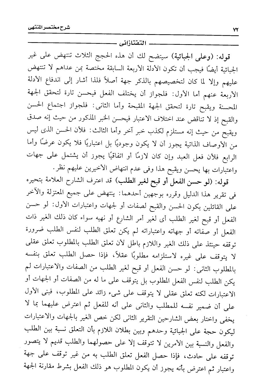 قوله: (لو حسن الفعل أو قبح لغير الطلب) قد اعترف الشارح العلامة بتحيره فى تقرير هذا الدليل وقرره بوجهين أحدهما: ينتهض على جميع المعتزلة والآخر على القائلين بكون الحسن والقبح لصفات أو لجهات واعتبارات الأول: لو حسن الفعل أو قبح لغير الطلب أى لغير أمر الشارع أو نهيه سواء كان ذلك الغير ذات الفعل أو صفاته أو جهاته واعتباراته لم يكن تعلق الطلب لنفس الطلب ضرورة توقفه حينئذ على ذلك الغير واللازم باطل لأن تعلق الطلب بالمطلوب تعلق عقلى لا يتوقف على غيره لاستلزامه مطلوبًا عقلًا، فإذا حصل الطلب تعلق بنفسه بالمطلوب الثانى: لو حسن الفعل أو قبح لغير الطلب من الصفات والاعتبارات لم يكن الطلب لنفس الفعل المطلوب بل يتوقف على ما له من الصفات أو الجهات أو الاعتبارات لكنه تعلق عقلى لا يتوقف على شئ زائد على المطلوب، فبنى الأول على أن ضمير نفسه للمطلب والثانى على أنه للفعل ثم اعترض عليهما بما لا يخفى واختار بعض الشارحين التقرير الثانى لكن خص الغير بالجهات والاعتبارات ليكون حجة على الجبائية وحدهم وبين بطلان اللازم بأن التعلق نسبة بين الطلب والفعل والنسبة بين الأمرين لا تتوقف إلا على حصولهما والطلب قديم لا يتصور توقفه على حادث، فإذا حصل الفعل تعلق الطلب به من غير توقف على جهة واعتبار ثم اعترض بأنه يجوز أن يكون المطلوب هو ذلك الفعل بشرط مقارنة الجهة